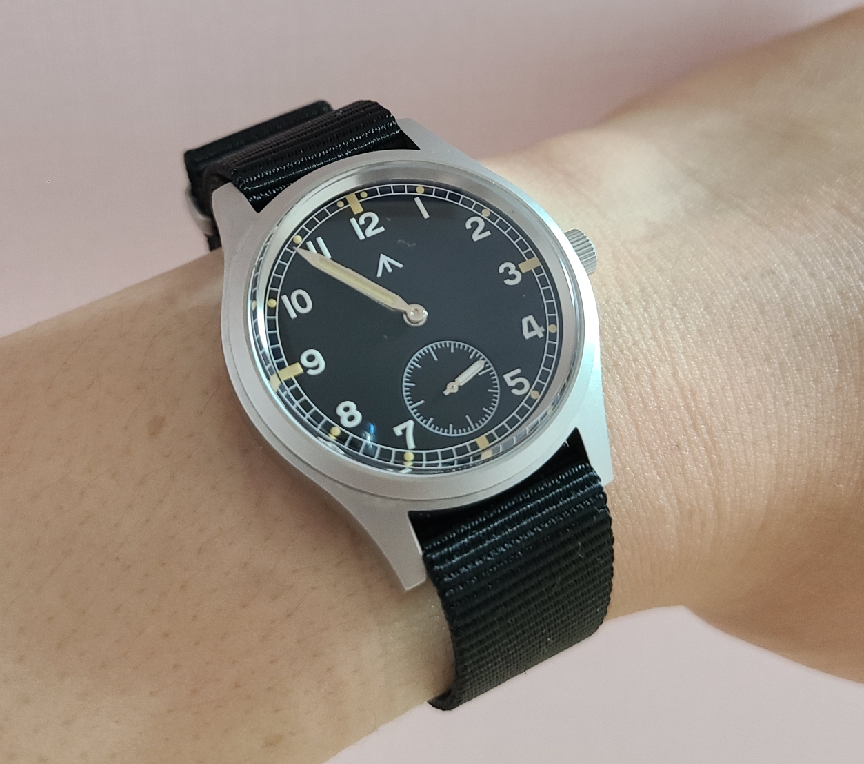 영국군 군납의 상징인 브로드애로우가 12시 방향에 위치하고 있고, 스몰 세컨즈가 6시 방향에 위치합니다. 케이스가 36mm라서 아담하게 느껴집니다. 광택 없는 케이스는 군용 손목시계의 맛을 내기에 아주 적절했다고 생각합니다.