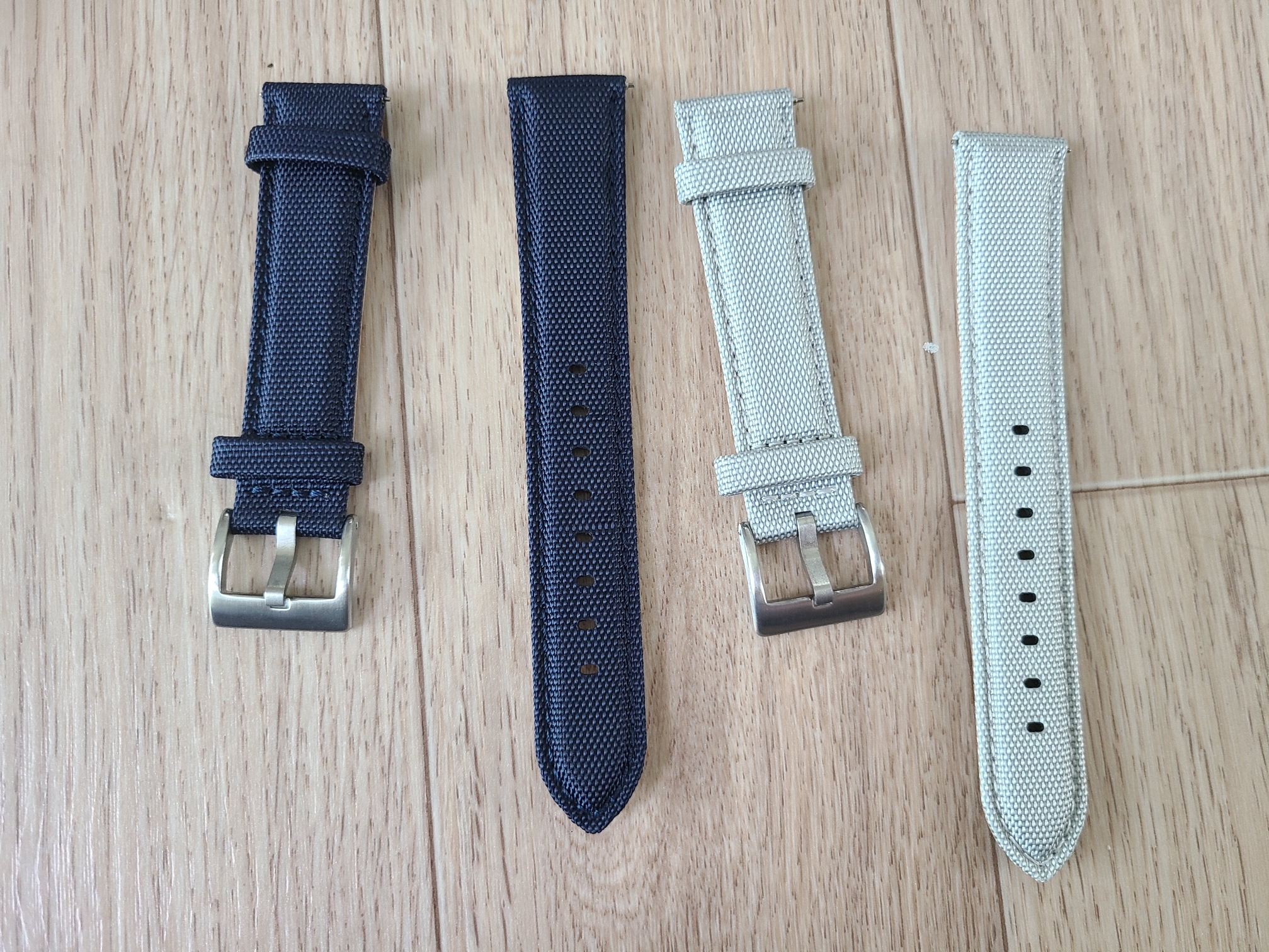 이렇게 두 가지를 구입했습니다. 남색에 가까운 청색과 회색 줄입니다. 시계판에 파란색 계열의 초침, 크로노그래프 (chronograph)침이 있어서 진한 청색의 줄이 어울릴 것 같았고, 회색판이라 무난하게 회색줄을 구입해봤습니다.