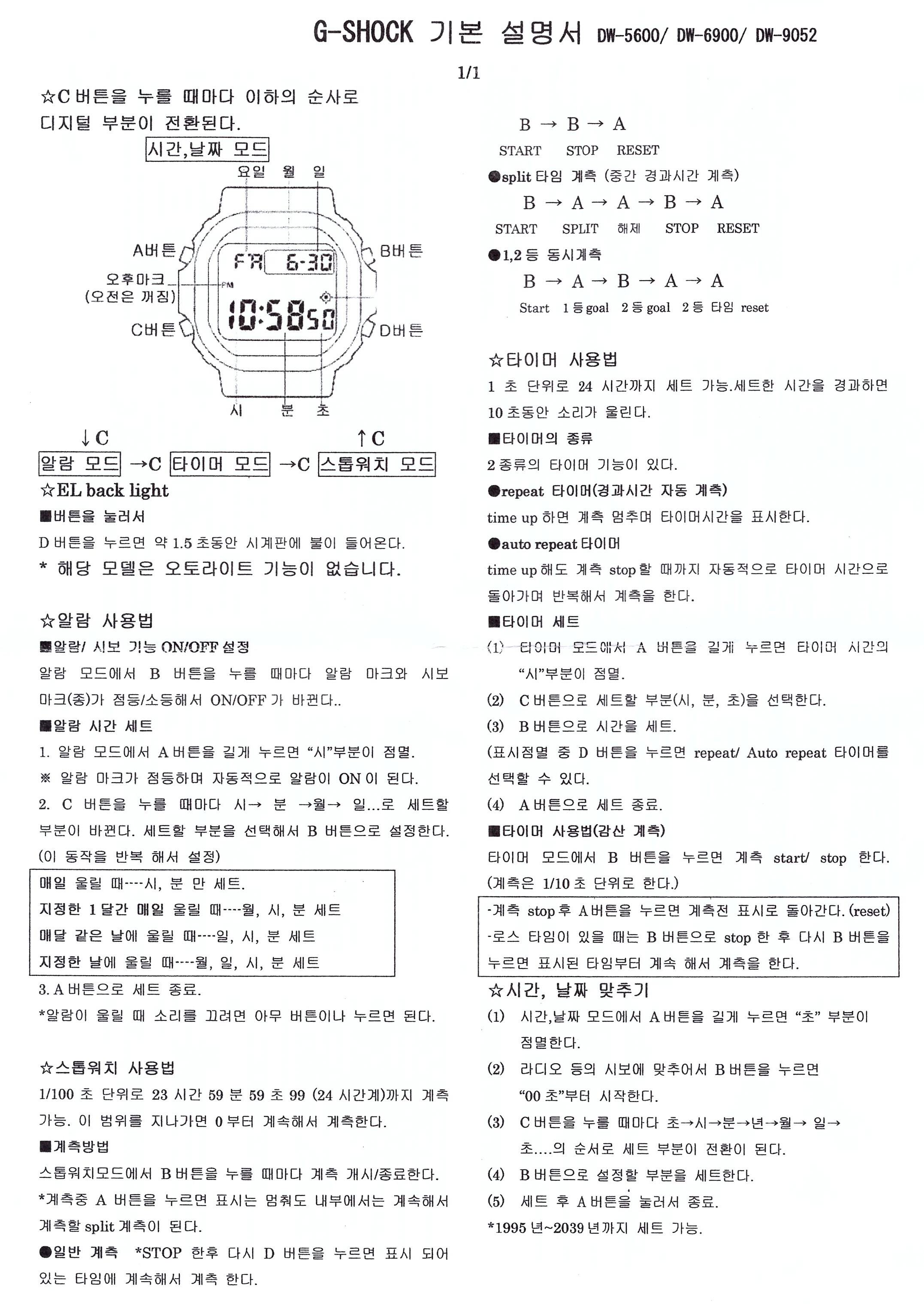 아래는 이 시계 (DW-9052GBX)의 사용법에 대한 설명서입니다.