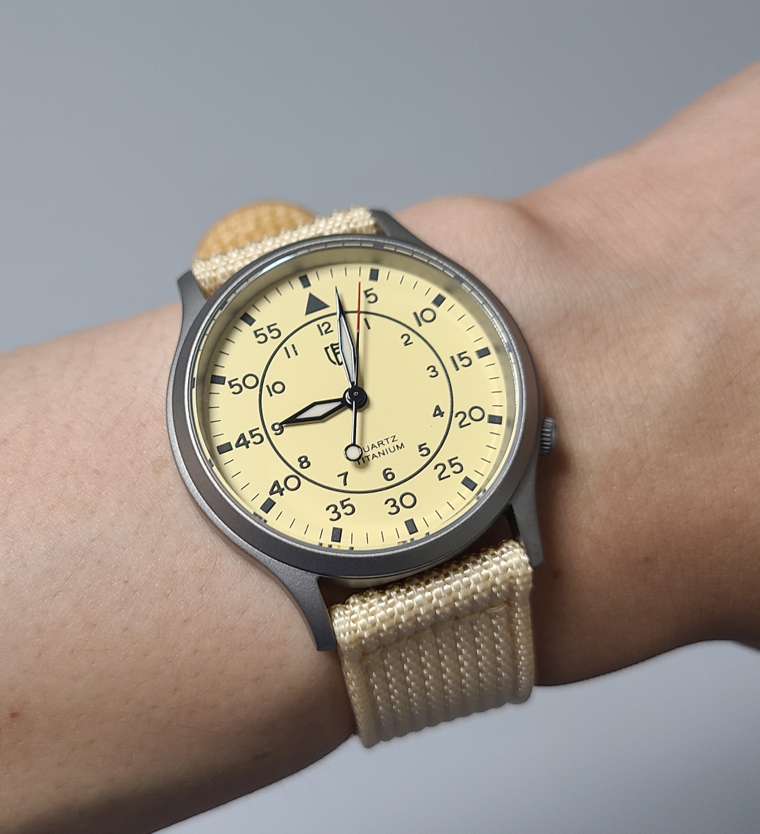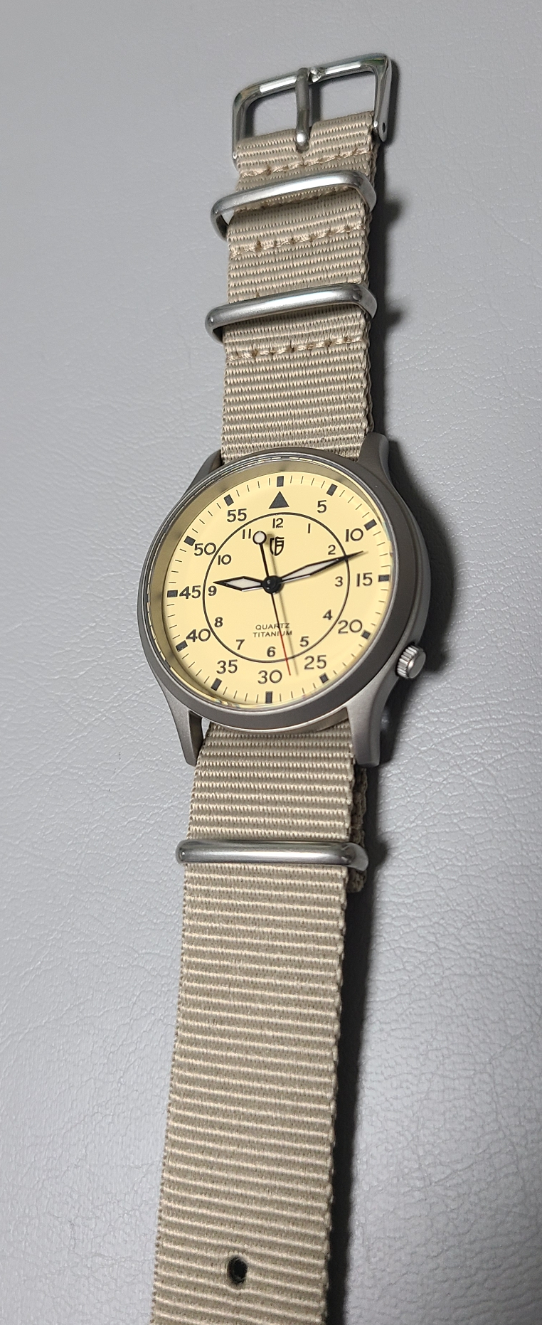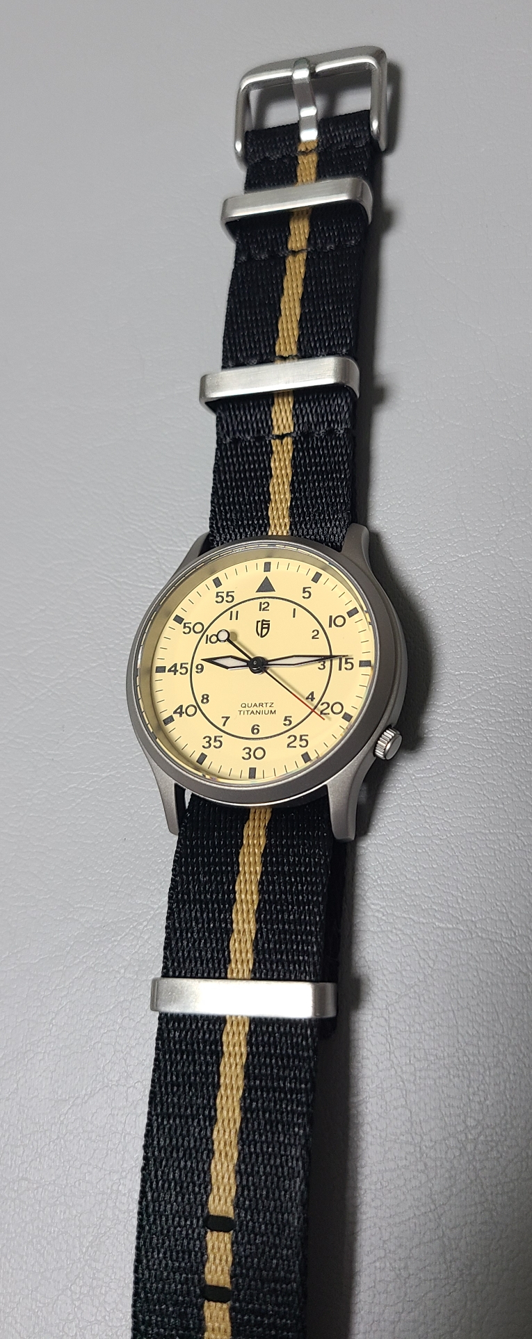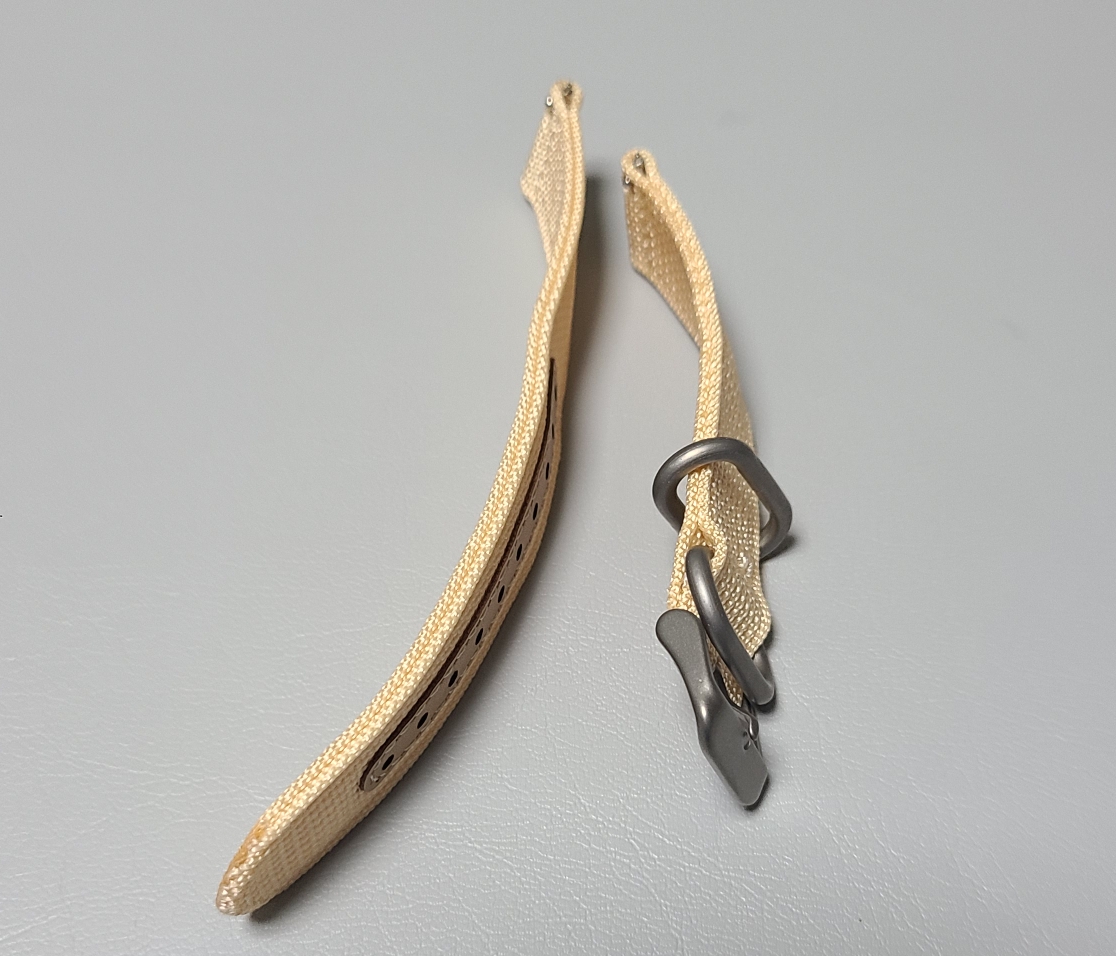 후보 3번, 회색빛이 도는 베이지색 나토 스트랩입니다. 세 스트랩 중에서 가장 마음에 드네요. 적당히 밝은색이면서도 다이얼의 빛깔이 돋보이게 하는것 같습니다.