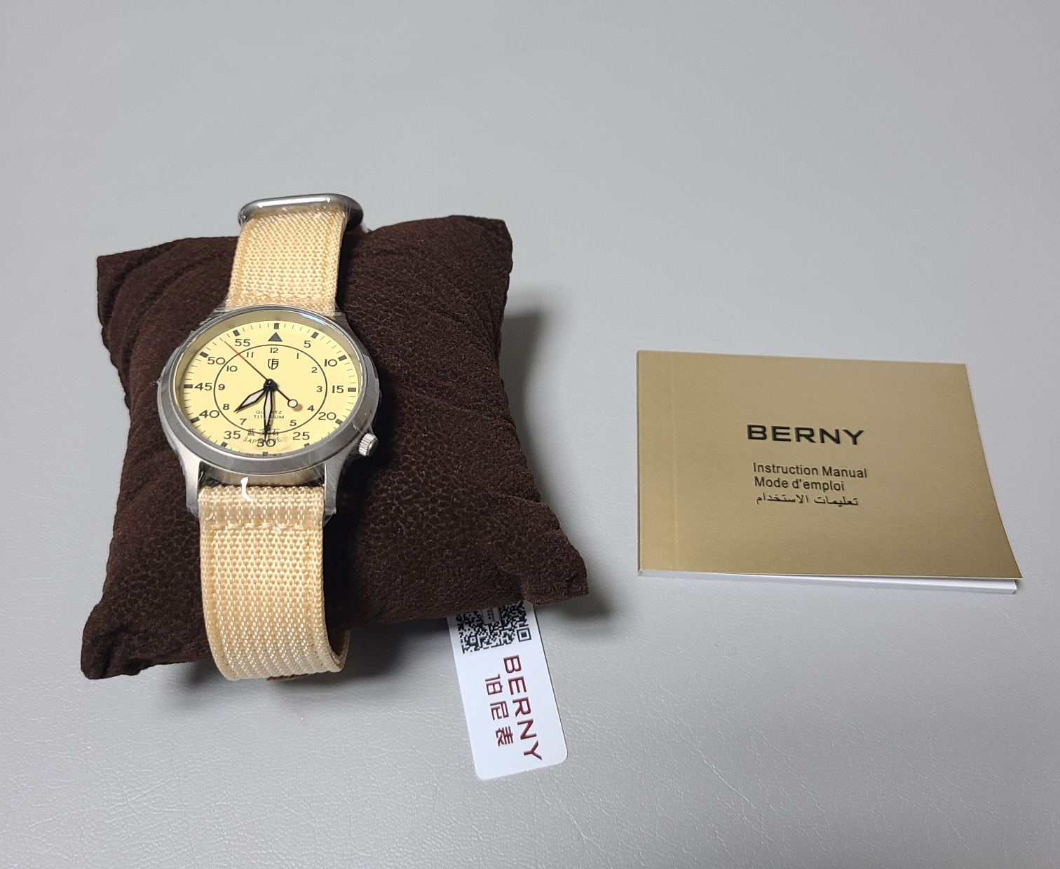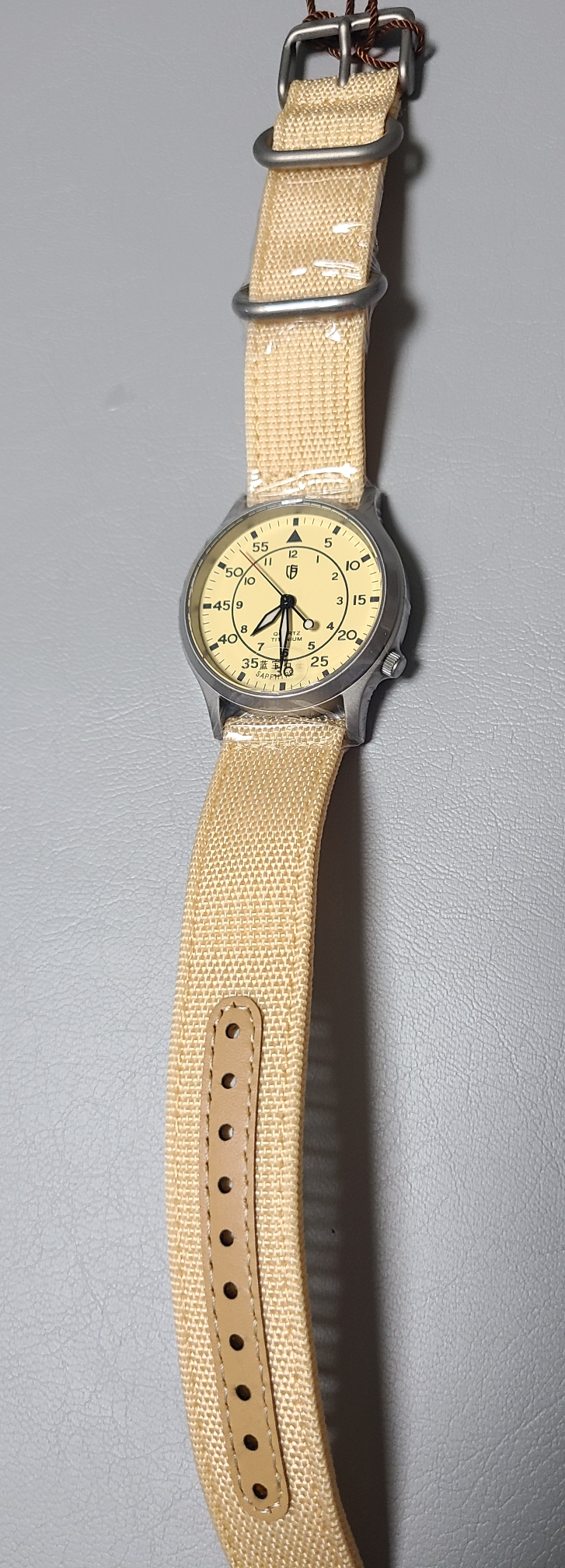 비닐을 제거하면 티타늄 특유의 색감이 드러납니다. 쿼츠 무브먼트이다보니 시계를 멈추기 위해 용두를 뽑아놓은 상태로 고정해서 배송했습니다. 해외배송에 오랜시간이 걸리니 배터리까지 신경써주네요.