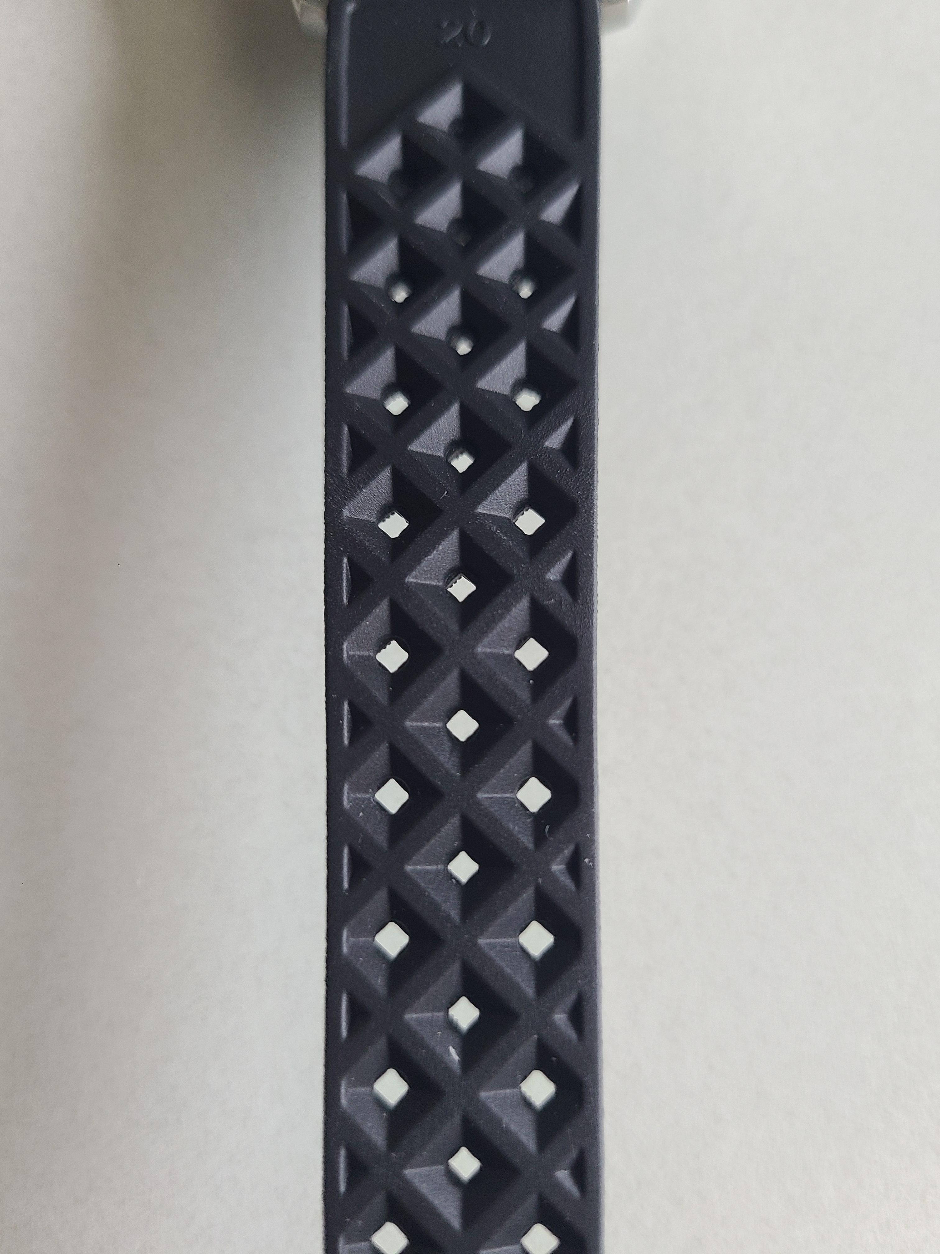 와플모양의 안쪽면 마감은 수분 배출을 돕는 디자인이라 합니다. 아직 이 스트랩을 착용하고 물속에 들어가보지는 않아서 어느정도의 효과가 있을지는 아직 잘 모르겠습니다.