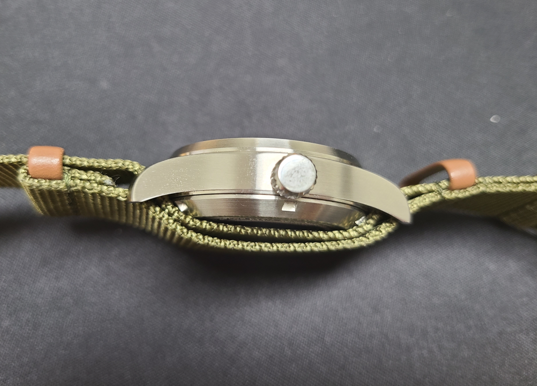 시계가 얇지는 않고, 두툼한 것이 필드워치라 어필하는 것 같습니다. 용두는 매끈하게 유광처리된 상태입니다.
