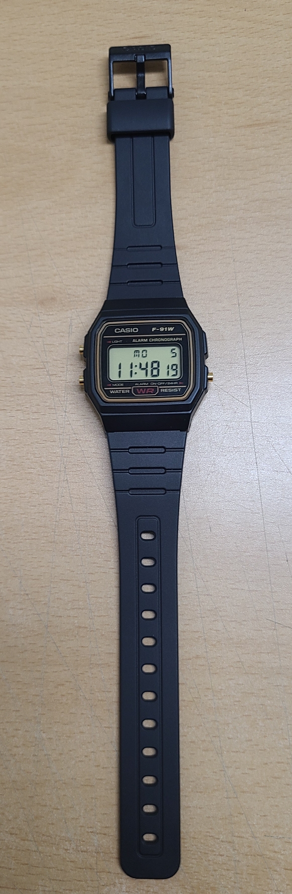 메탈 느낌의 A158W 시계 이후로 매트한 검은색의 F-91W를 새로 들였습니다. 정확한 제품명은 F-91WG-9S 이고, 쿠팡에서 2만원이 채 안되는 가격에 샀습니다.