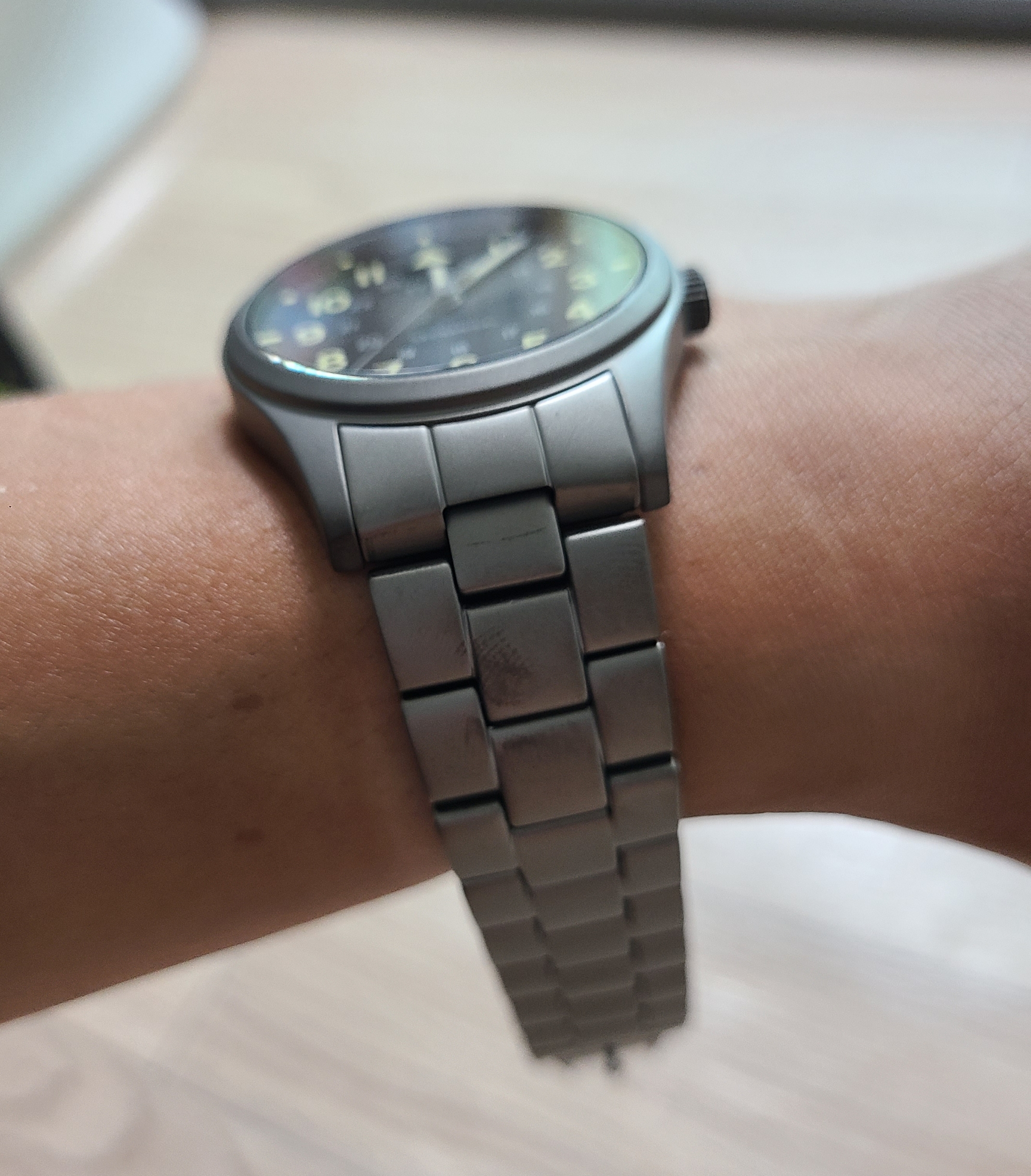 스트랩 길이를 줄이고 시간도 맞춘 뒤 다시 촬영해봤습니다. 흔한 카키필드 디자인이 뭐가 그리 좋아보였을까요. 비싸게 샀지만 충분히 만족스럽습니다.