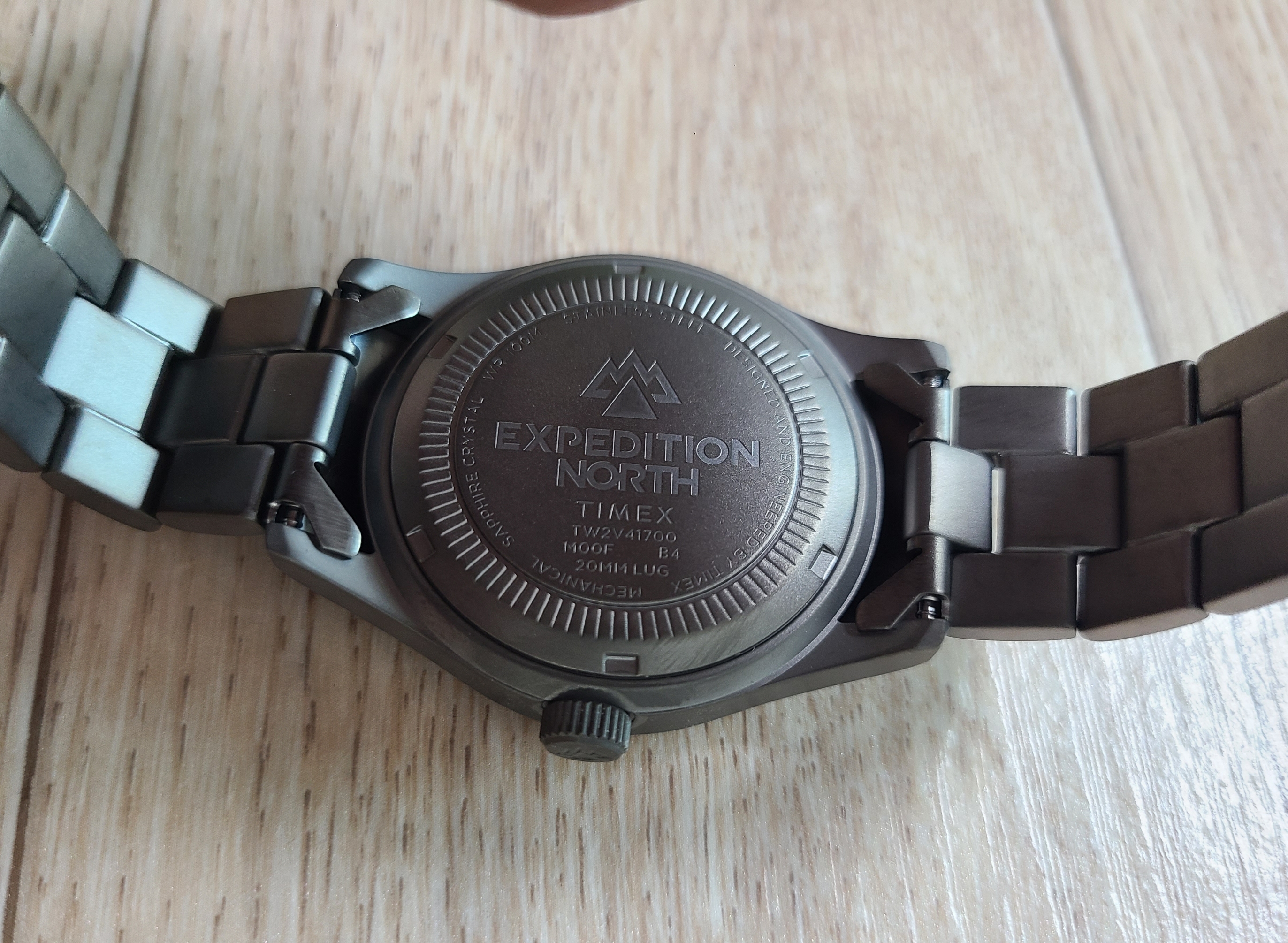 케이스백에는 익스페디션 노스(Expedition North)와 타이맥스(Timex) 각인이 새겨져있고, 스크류 다운 형식으로 잠겨있습니다.