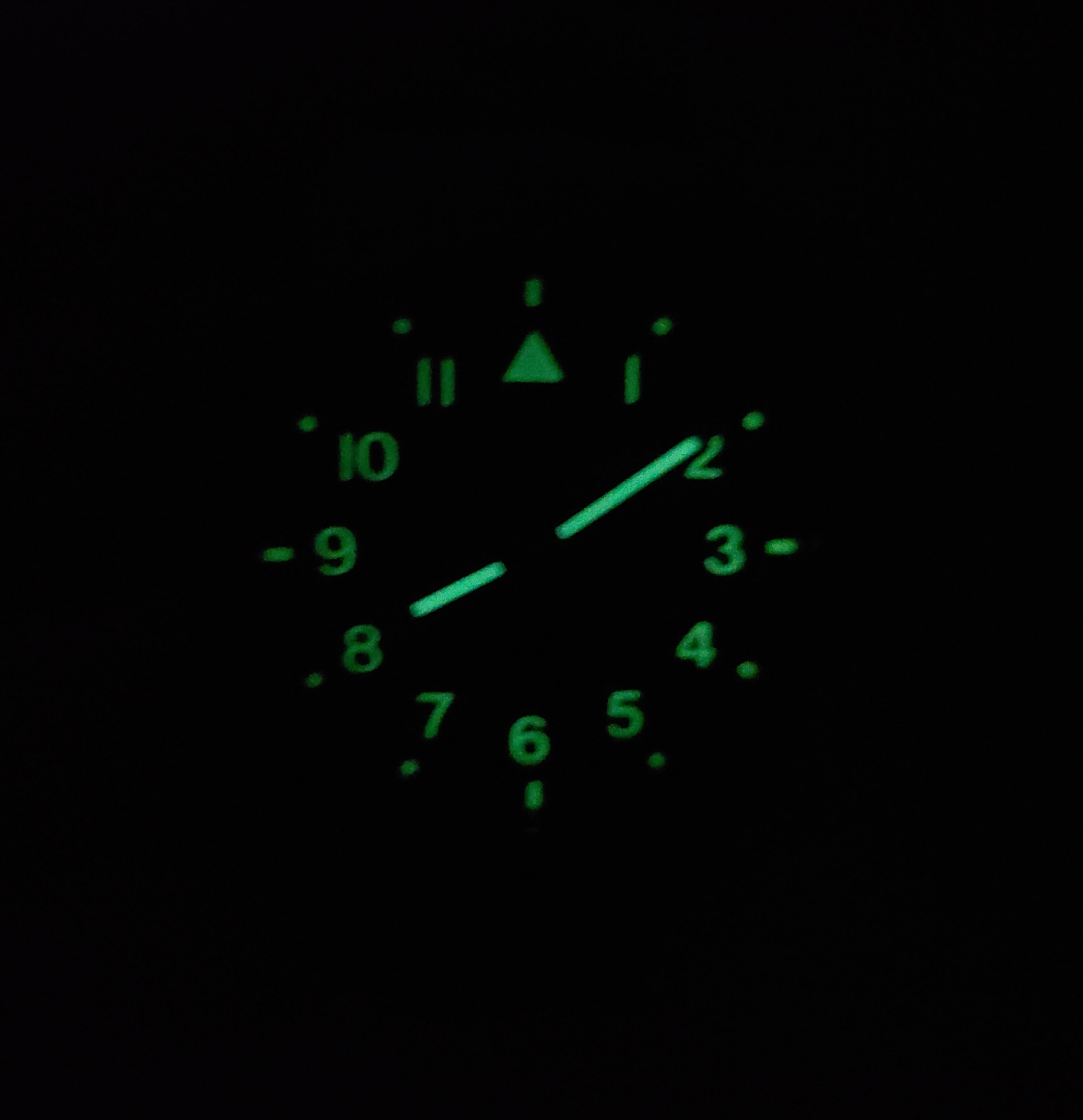 야간 촬영 모드를 켜지 않고 사진을 찍어도 야광이 잘 보이는 정도입니다. 필드워치에 걸맞는 야광이라고 할 수 있겠습니다.