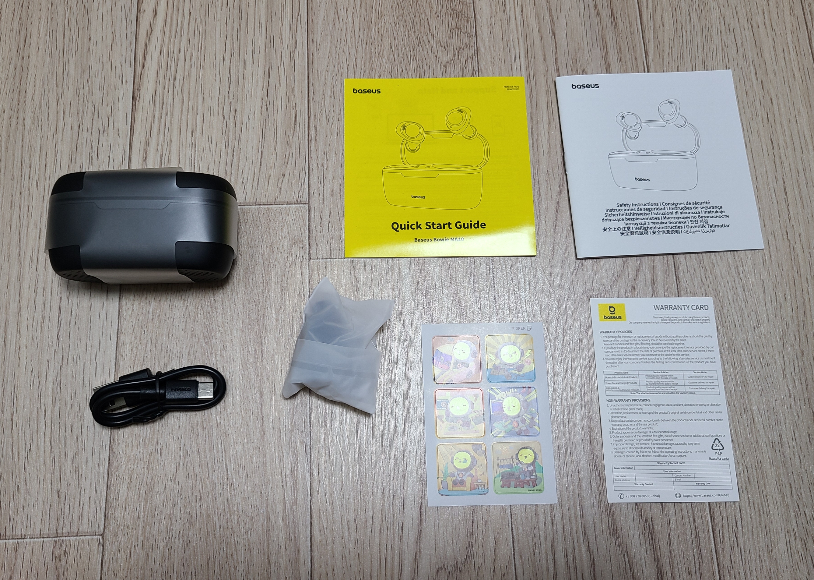 박스를 열면 충전 케이블과 설명서에 더해 작은 스티커와 이어팁까지 들어있습니다. 가격에 걸맞지 않는 섬세함이네요.