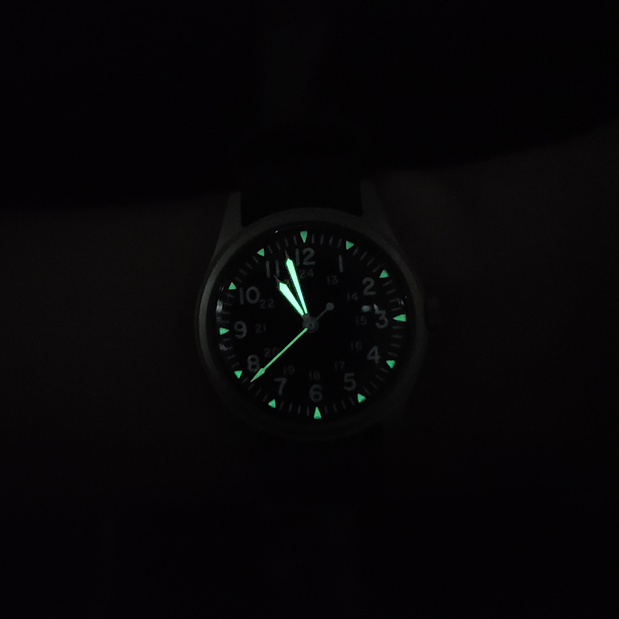 야광이 아주 밝지는 않지만 빛을 머금고 있을 땐 더 매력적인 모습이 되는 것 같습니다. 얇고 가벼워서 집앞에 잠시 나설 때 자주 사용하는 편이고, 투박하지만 또 그런대로 나름의 멋이 있는 시계인 것 같습니다.