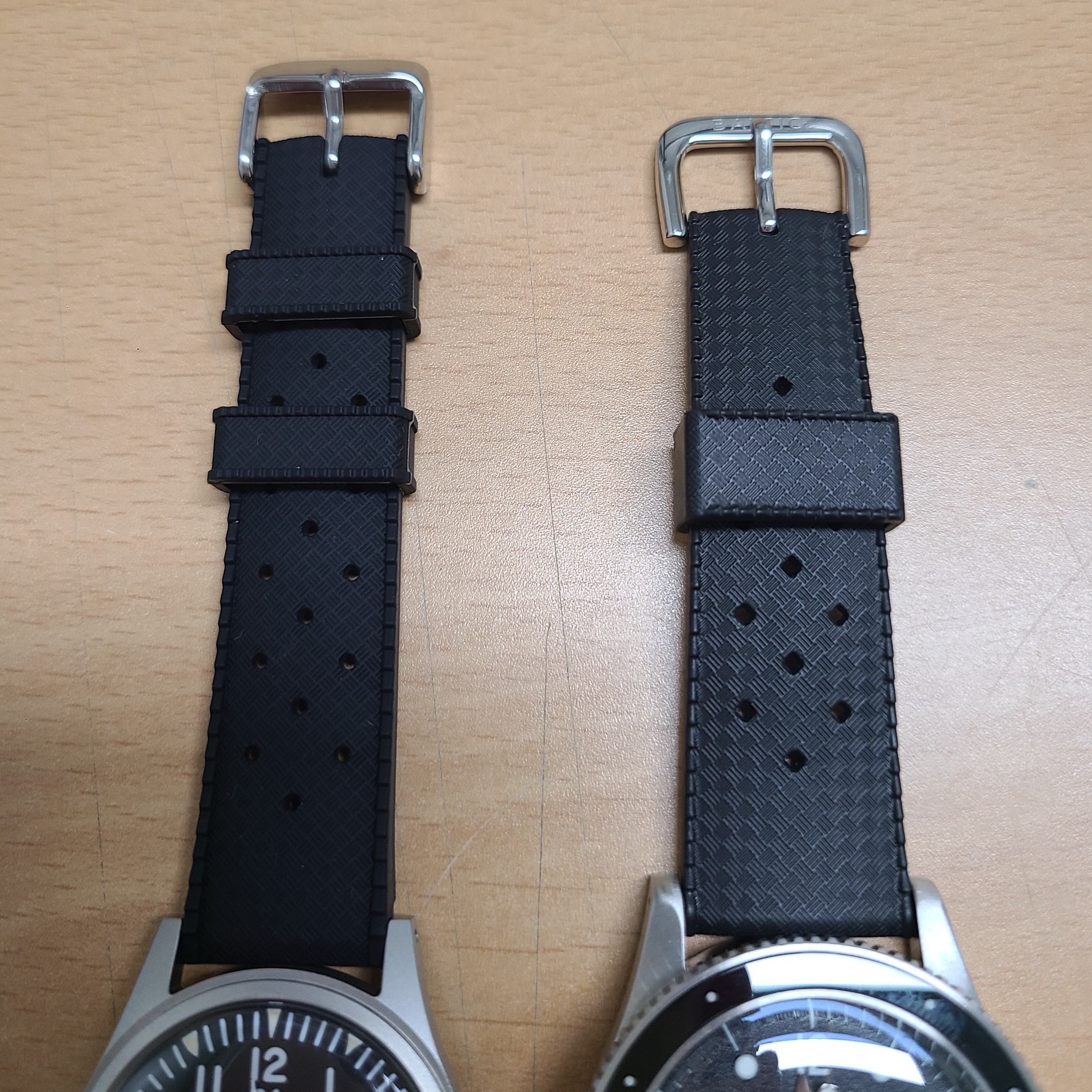 비교를 위해 발틱(BALTIC)의 아쿠아스카프(Aquascaphe)를 데려왔습니다. 알리발 스트랩은 조금 더 색을 먹는 매트한 느낌이고, 발틱의 러버밴드는 약간의 광택이 있습니다.