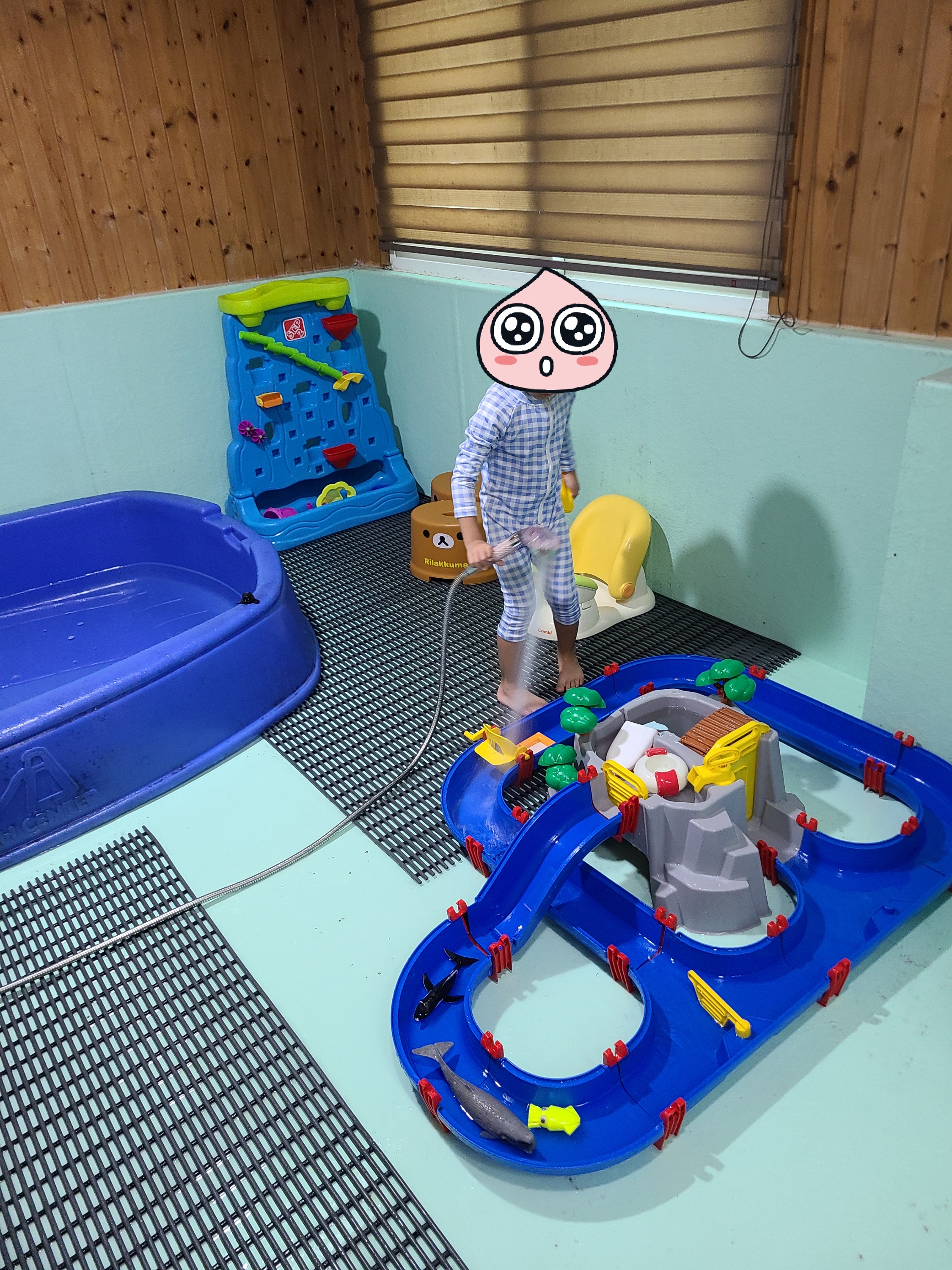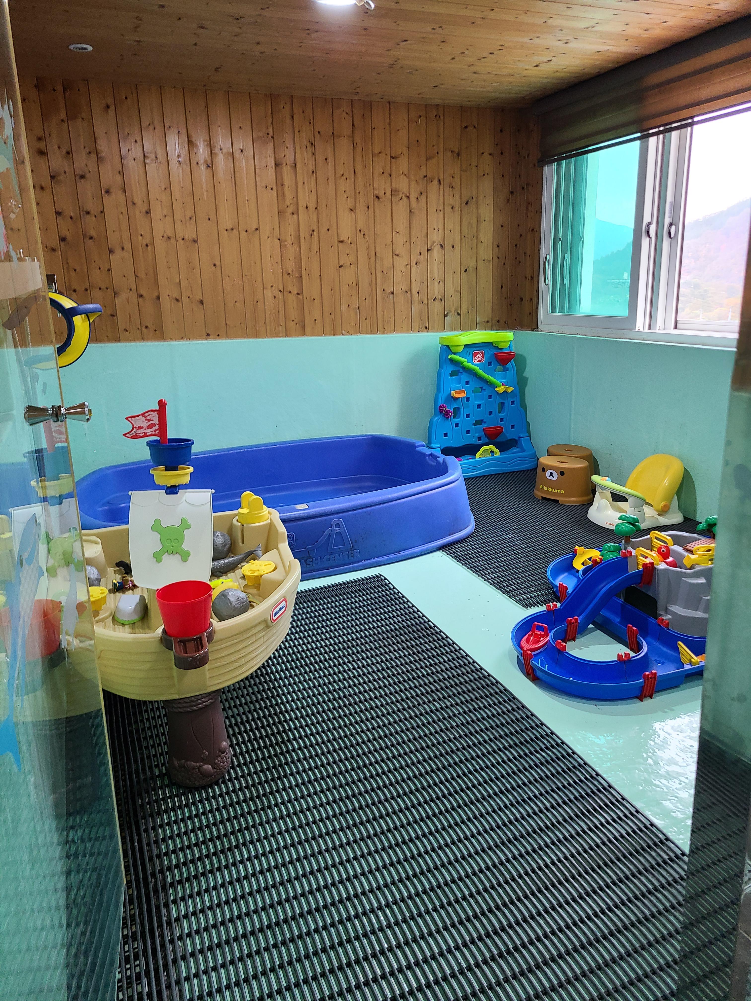전기그릴이 있는 테이블 반대편에는 물놀이장이 준비되어 있습니다. 욕조가 작을거라 생각했는데 생각보다 컸고, 거품놀이를 위한 입욕제(액체)도 원하는 만큼 사용할 수 있습니다. 또 물놀이 장난감이 함께 준비되어 있어 아이들이 좋아할만합니다.