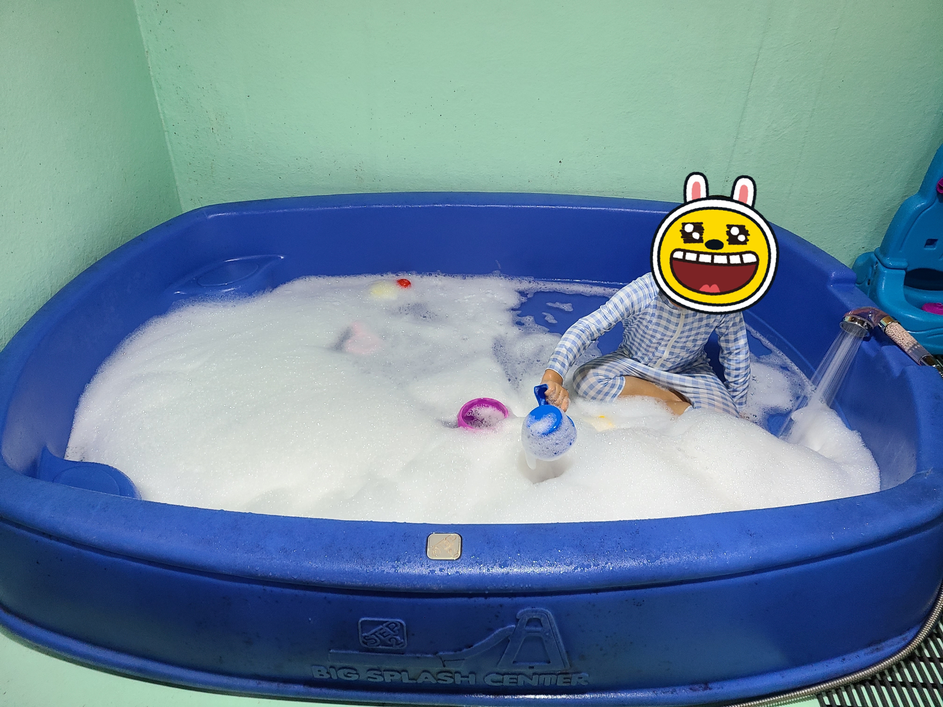 하지만 아주 깨끗하다고 말하기는 어렵습니다. 물놀이하는 욕조에 물을 받으려 하니 입욕제를 사용하기도 전부터 거품이 조금 보였습니다. 한 번 헹궈낸 뒤 물을 받아 놀았고, 이 부분은 감안하셔야 하겠습니다.