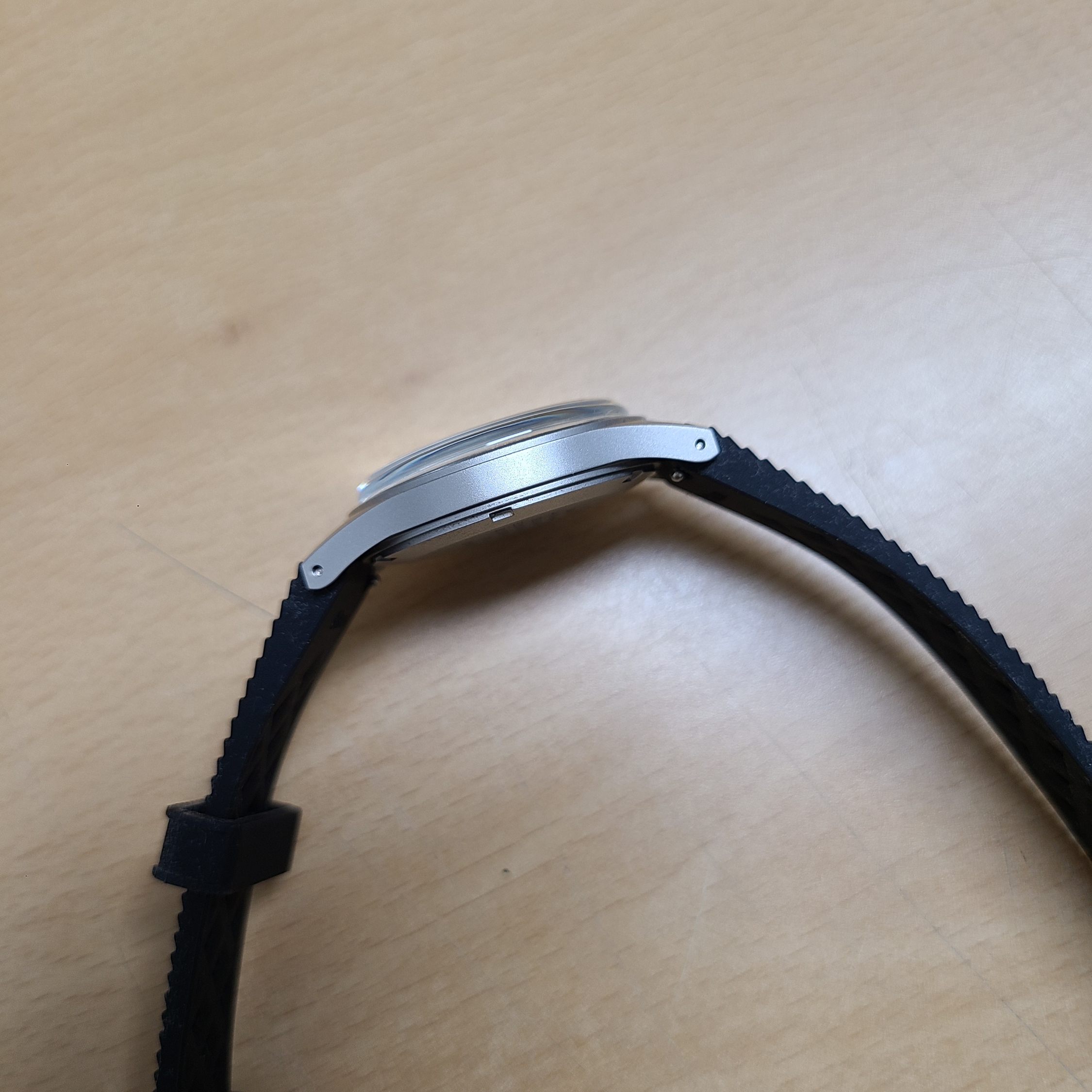 요즘 작고 편안한 시계들을 선호하면서 집앞에서만 착용하던 시계를 일터까지 데려오게 되었습니다. 돔형 글라스가 꽤나 두꺼운데도, 총 두께가 10.5mm라서 굉장히 얇은 시계입니다. 그만큼 가볍고 착용감이 편합니다.