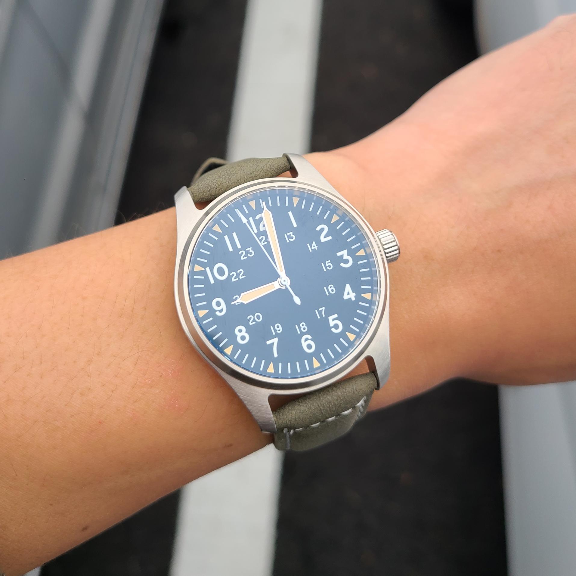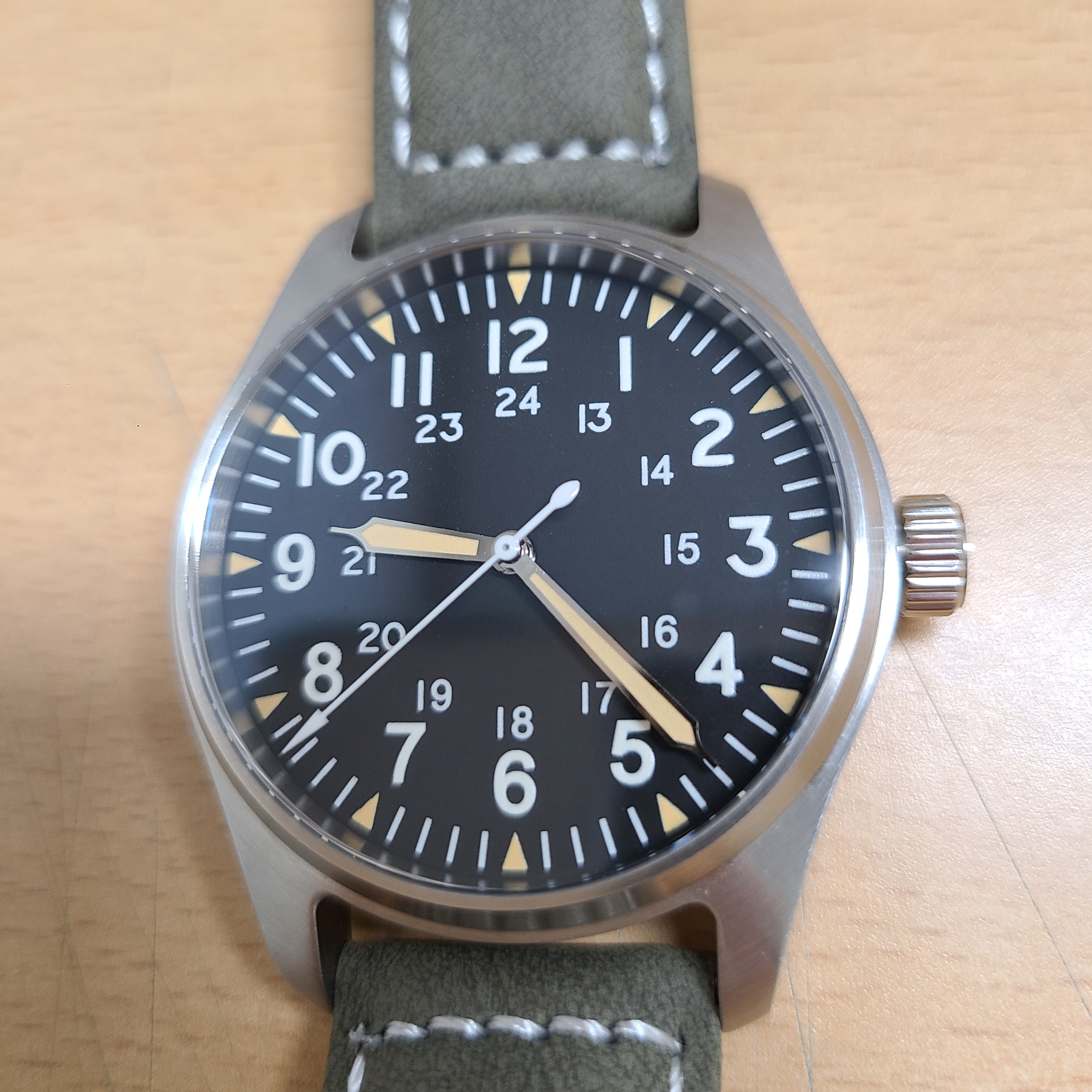 스트랩은 연한 올리브색의 가죽 재질이고, 매트한 느낌입니다. 버클이 굉장히 크고 가죽이 뻣뻣해서 필드워치에나 잘 어울릴만한 스트랩인 것 같습니다. 스트랩도 알리에서 구입했고, 아래 링크 남겨놓겠습니다.