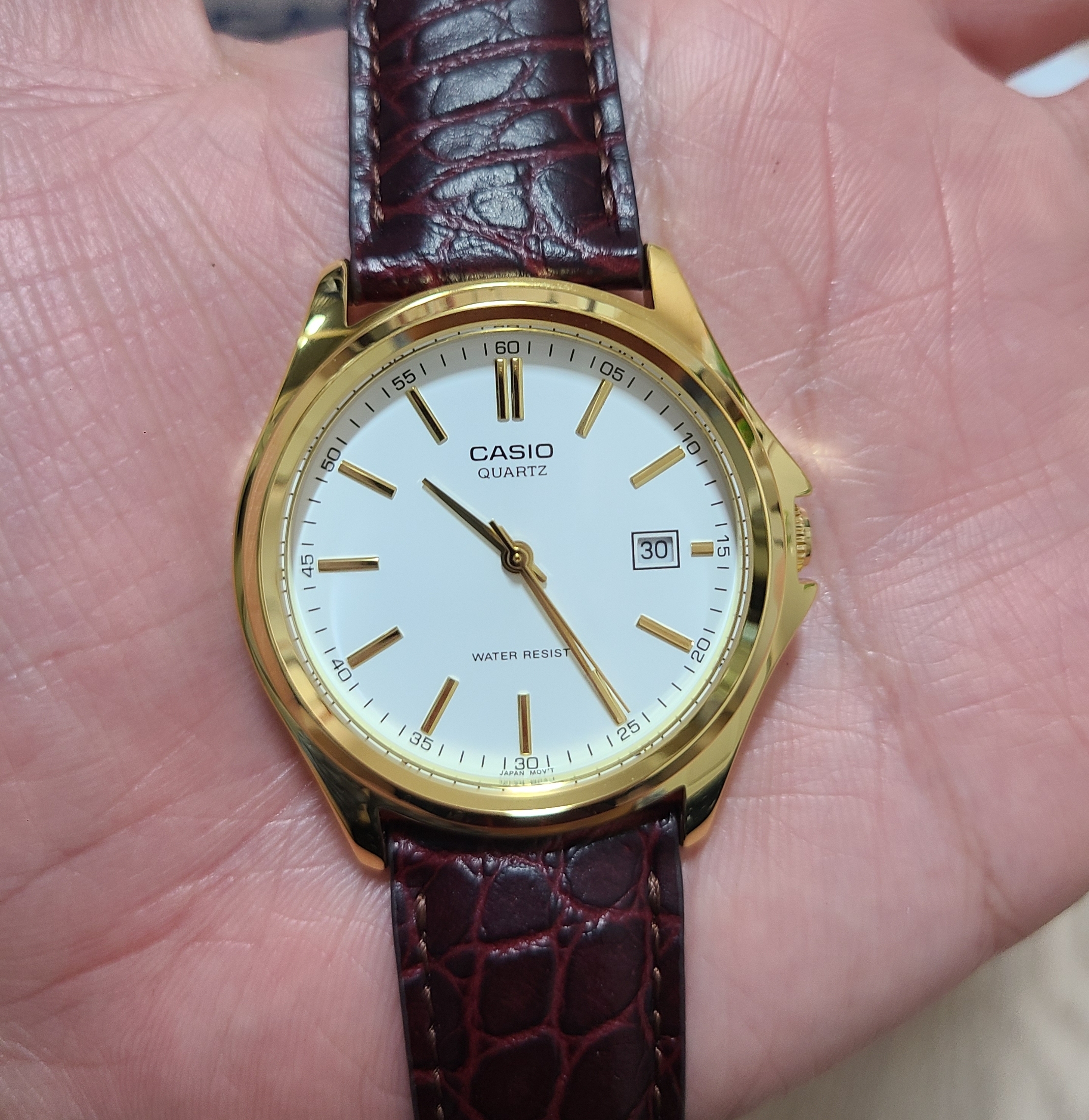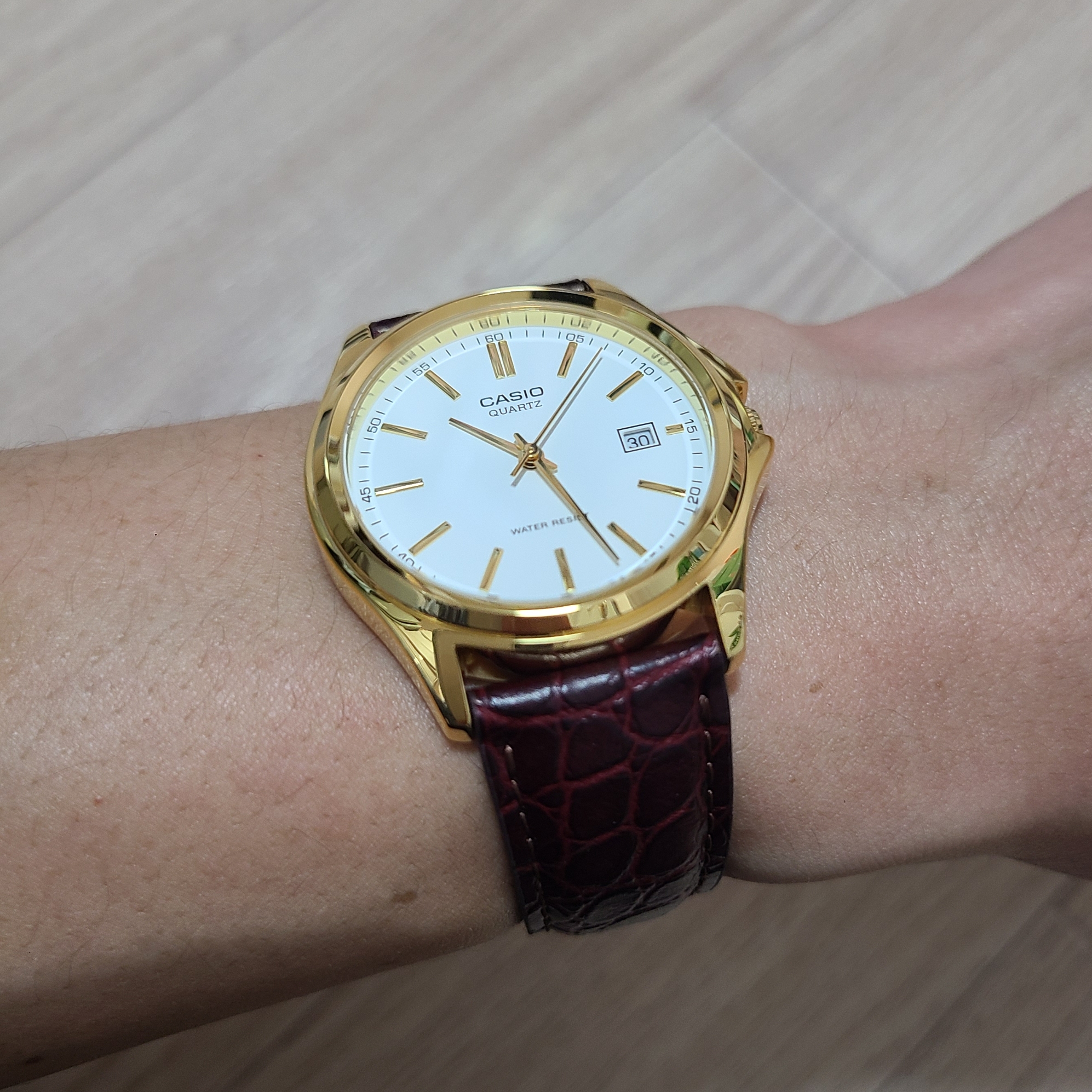 최근 카시오 시계 구입을 고민하고 있었습니다. 워낙 저렴하고 다양한 디자인이 있으니 뭘 살까 고민하다가 결국은 이 제품으로 샀습니다. MTP-1183Q-7A 입니다. 금장 케이스의 가죽 스트랩 제품이고, 은색 케이스의 시계도 살까 고민했지만 일단 보류했습니다.