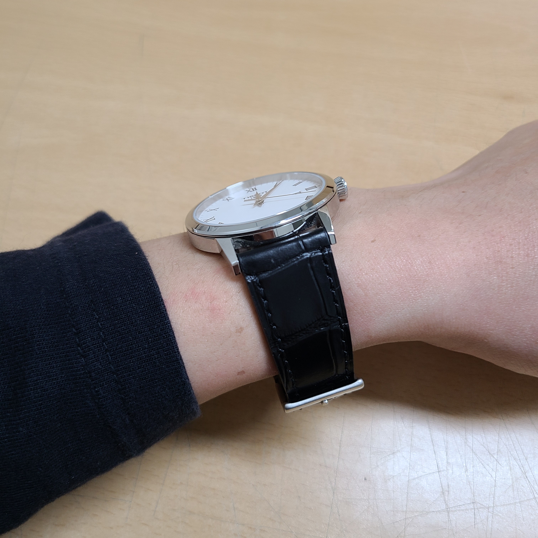 러그 너비가 22mm라서 스트랩이 저에게 많이 남을까 걱정했는데, 가죽의 두께가 적당히 있어서 그런지 가장 안쪽에 체결하면 딱 좋은 위치에서 흘러내리지 않습니다.