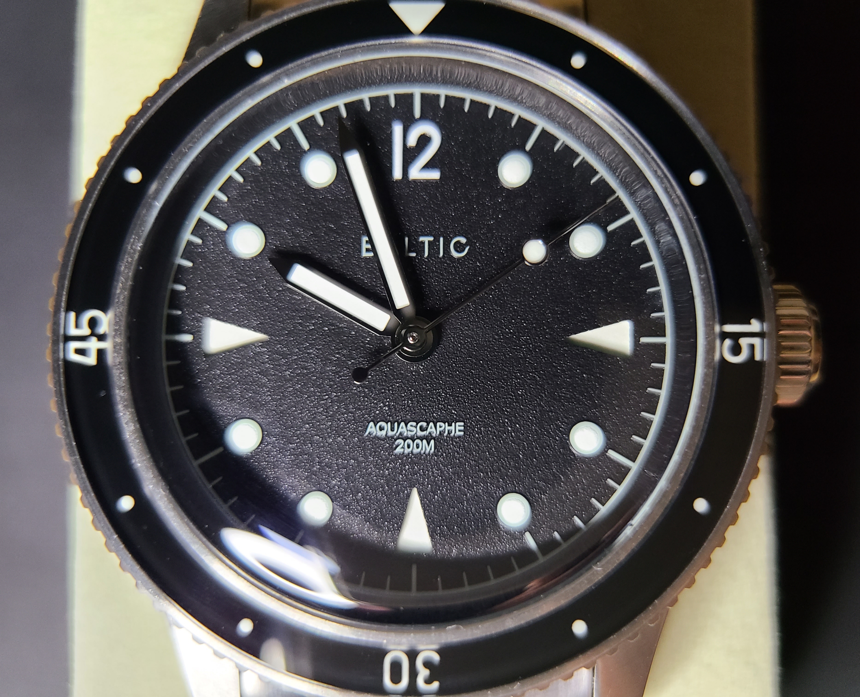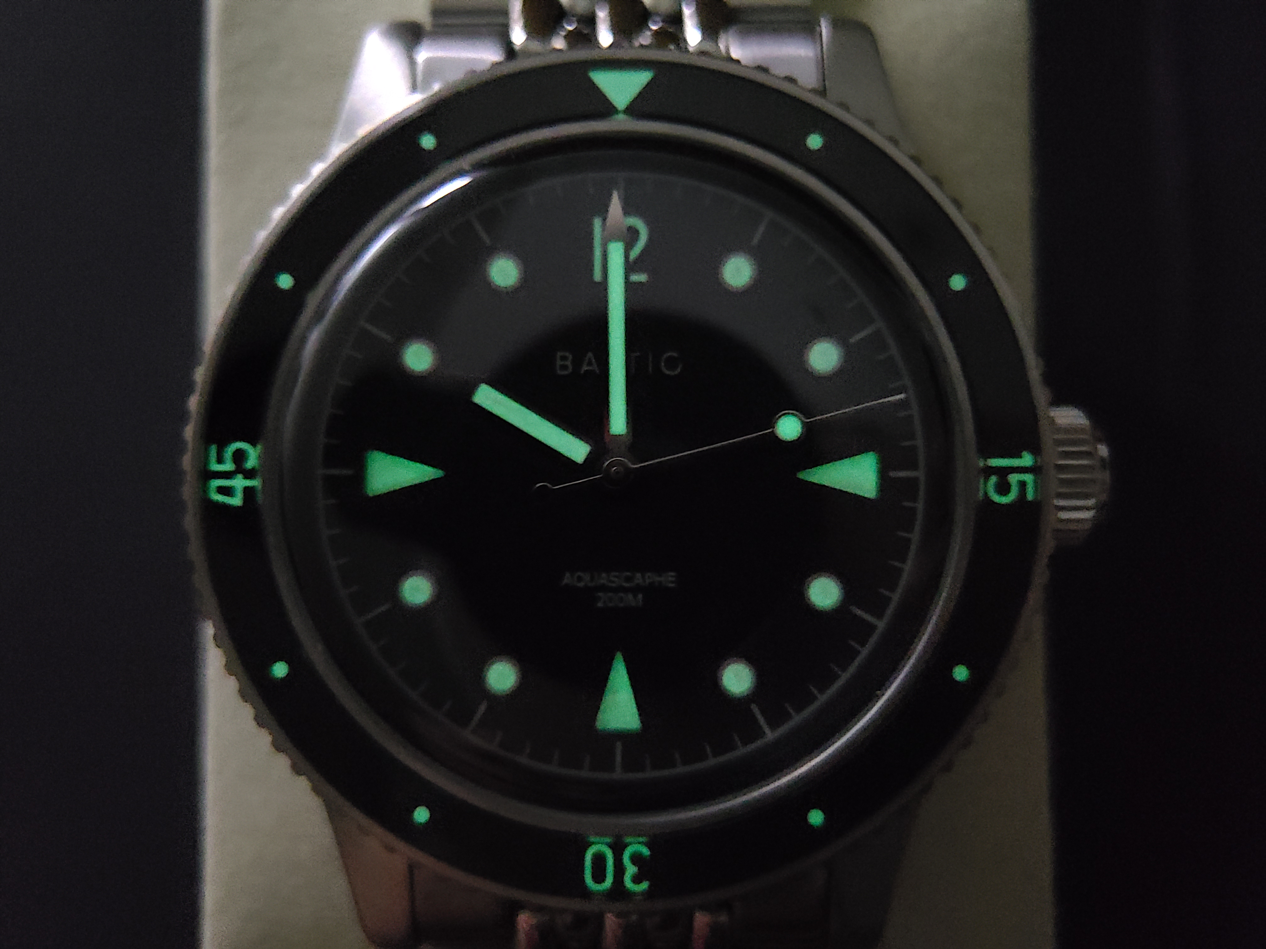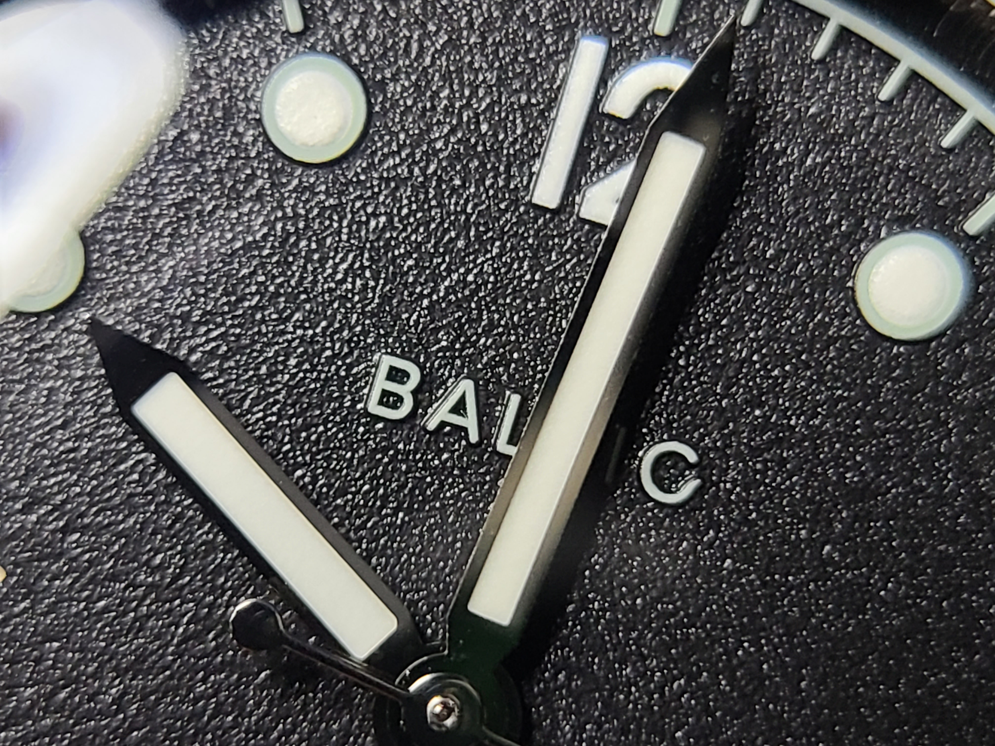 시간을 다시 맞추기가 귀찮아서 그냥 촬영했는데, 발틱(Baltic)도 마찬가지로 양각 위에 야광 도료가 얹어져 있습니다. 사포같은 다이얼도 자세히 볼 수 있었습니다.
