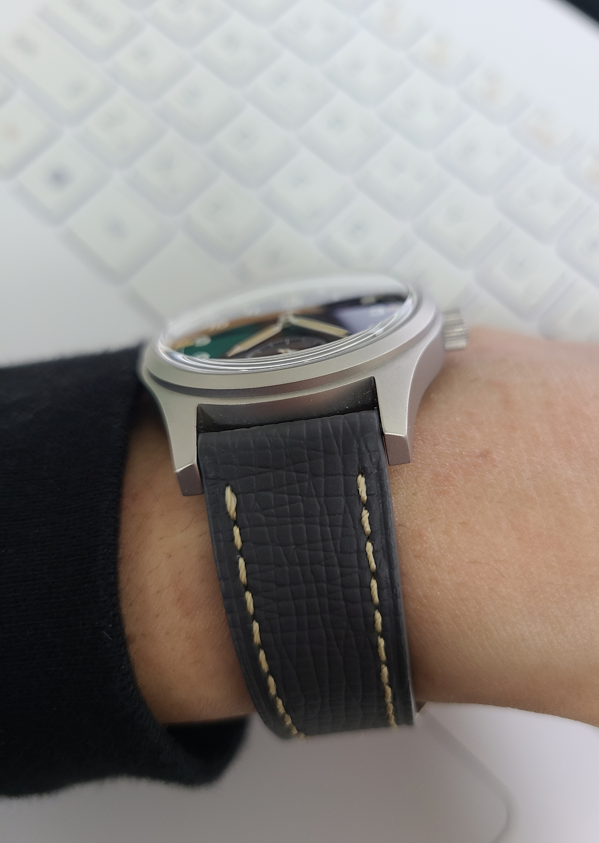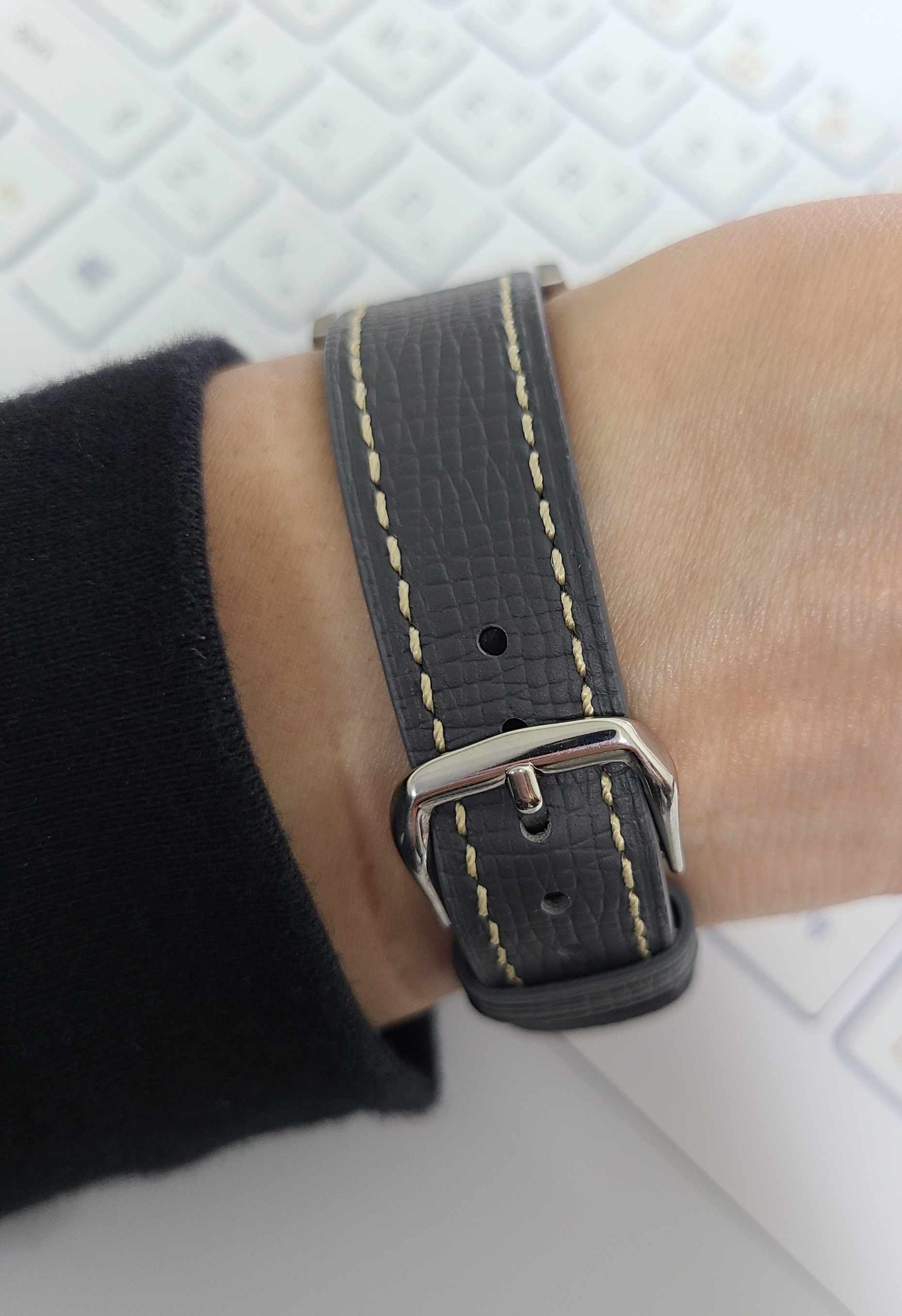 시계줄은 알리에서 주문한 진한 회색의 가죽 스트랩으로, 코끼리색에 가까운 것 같습니다. 매트한 느낌의 스트랩이 잘 어울리는 것 같아 골라봤습니다.