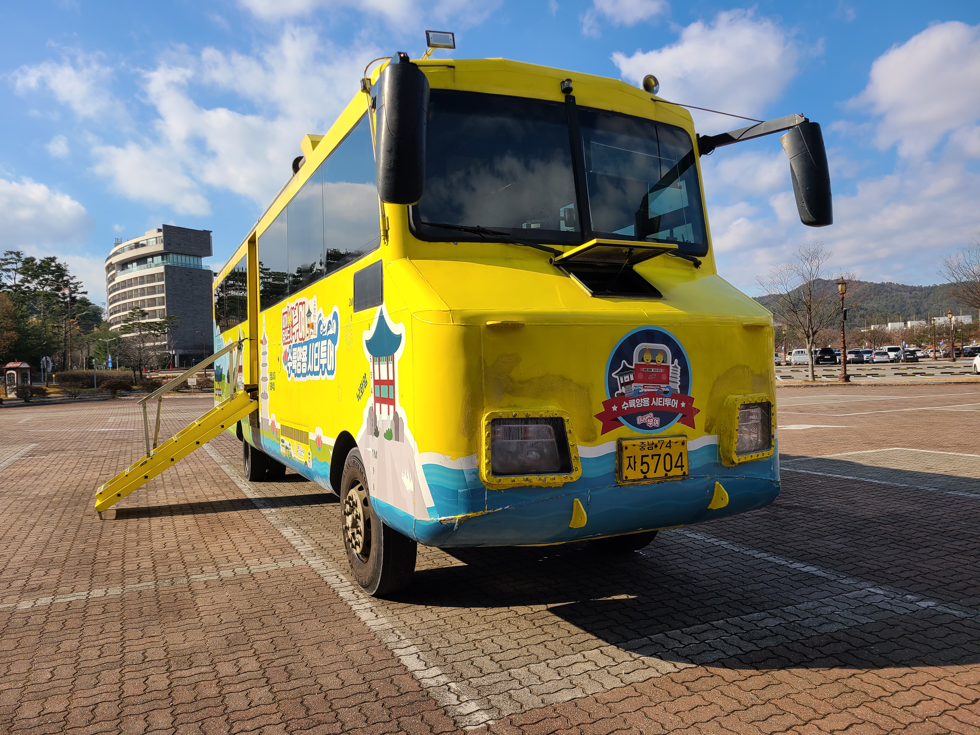 수륙양용버스는 일반적인 버스보다 더 높아서 계단을 내려줘야 탈 수 있습니다.