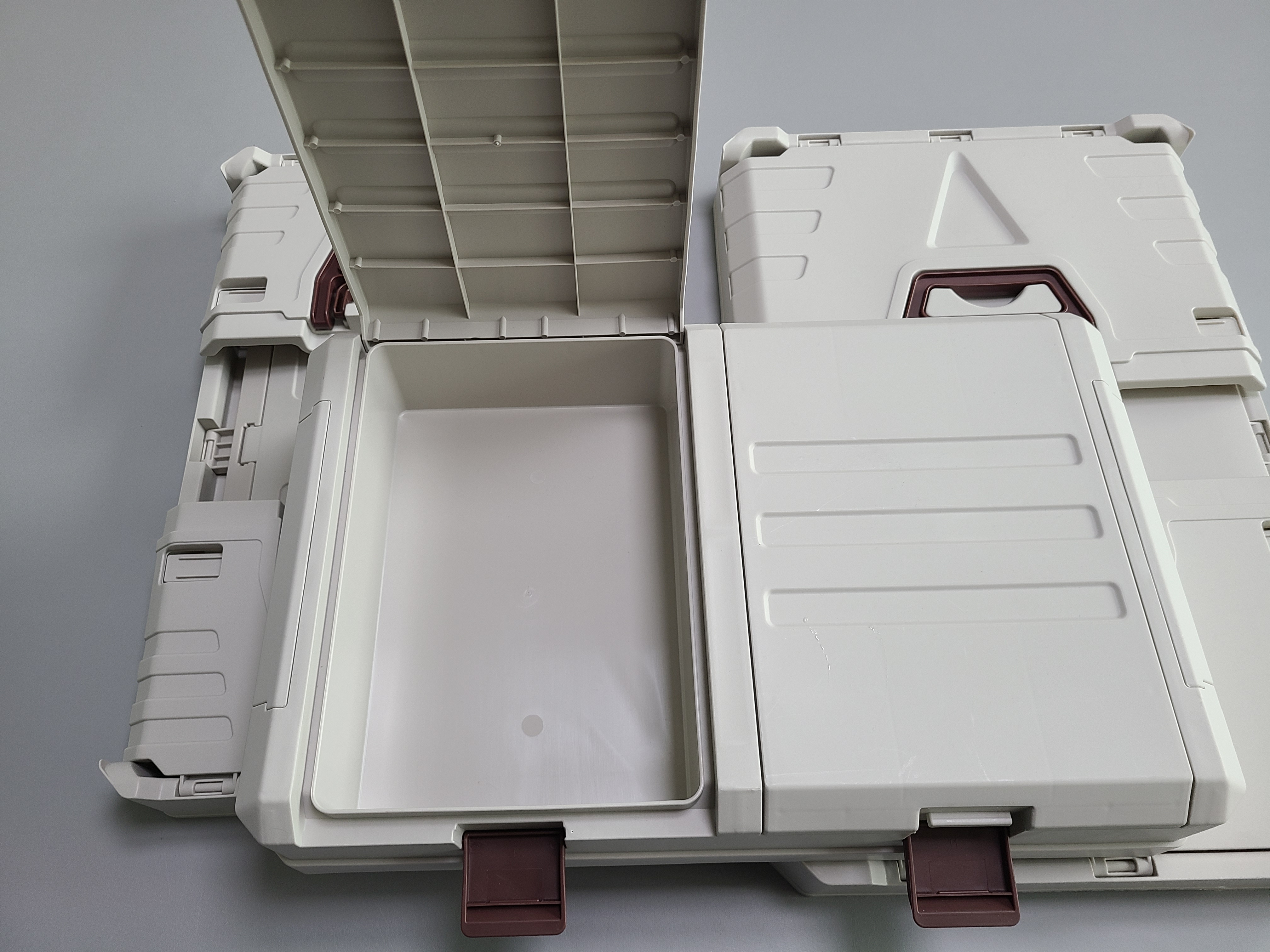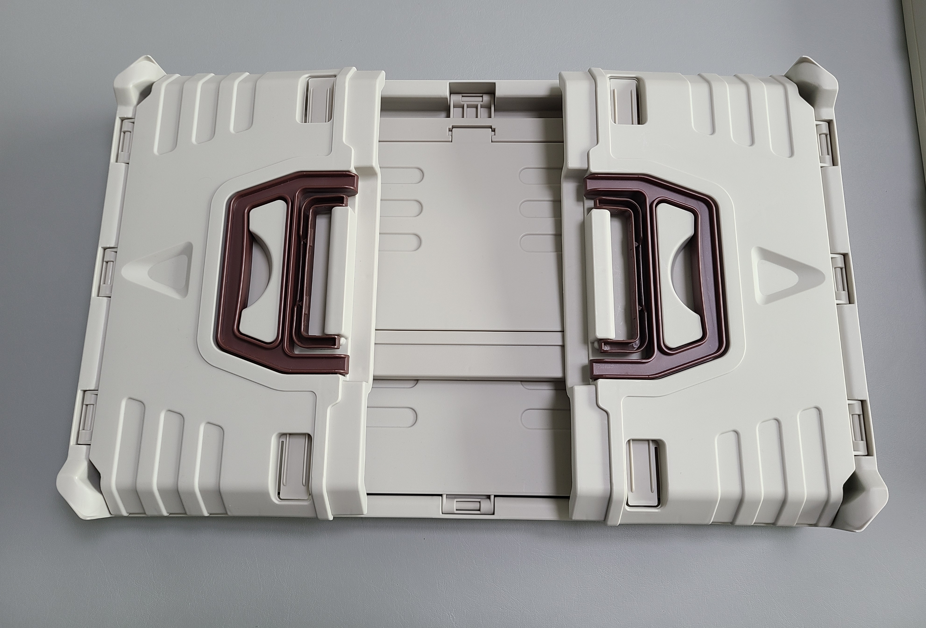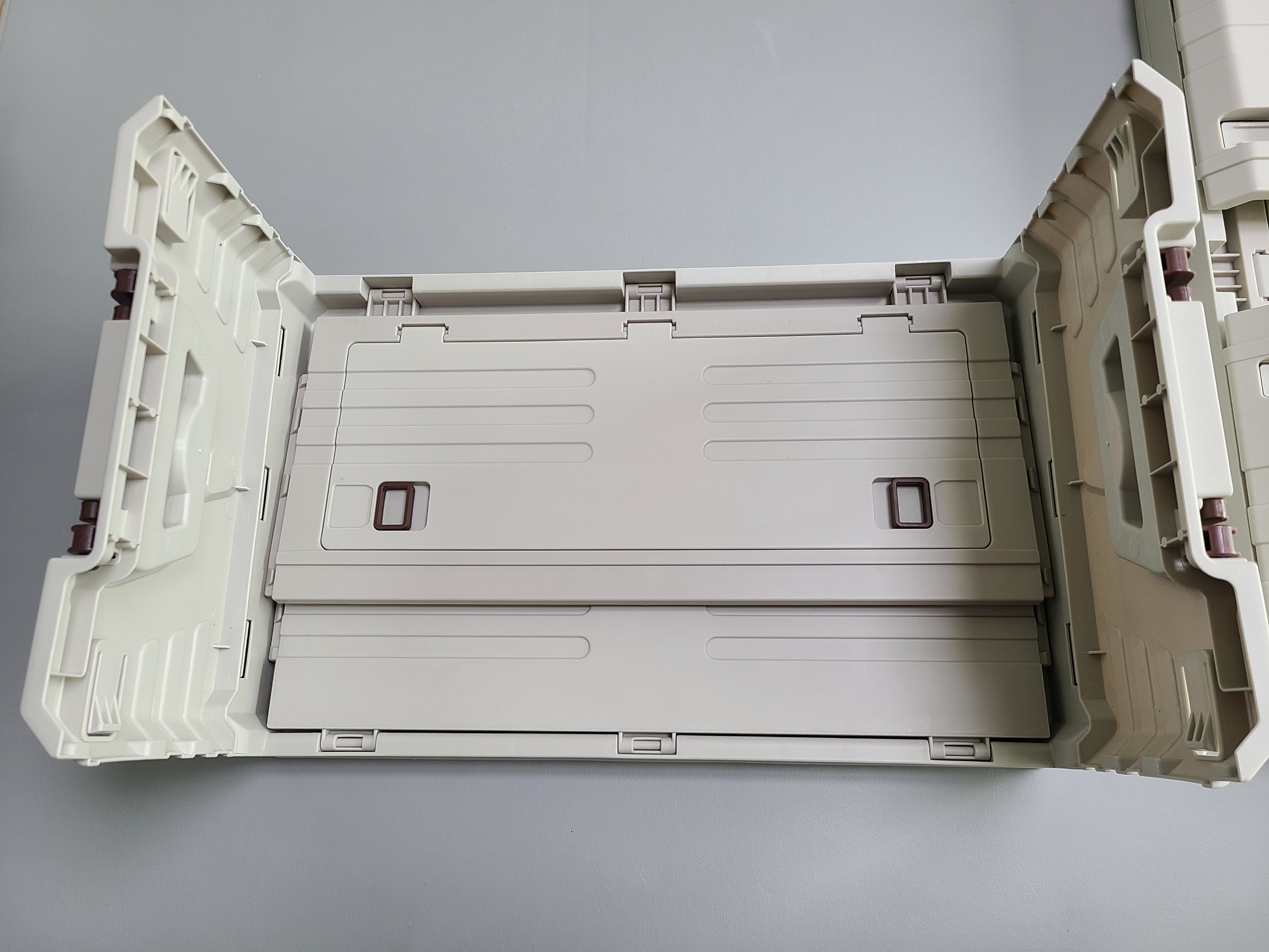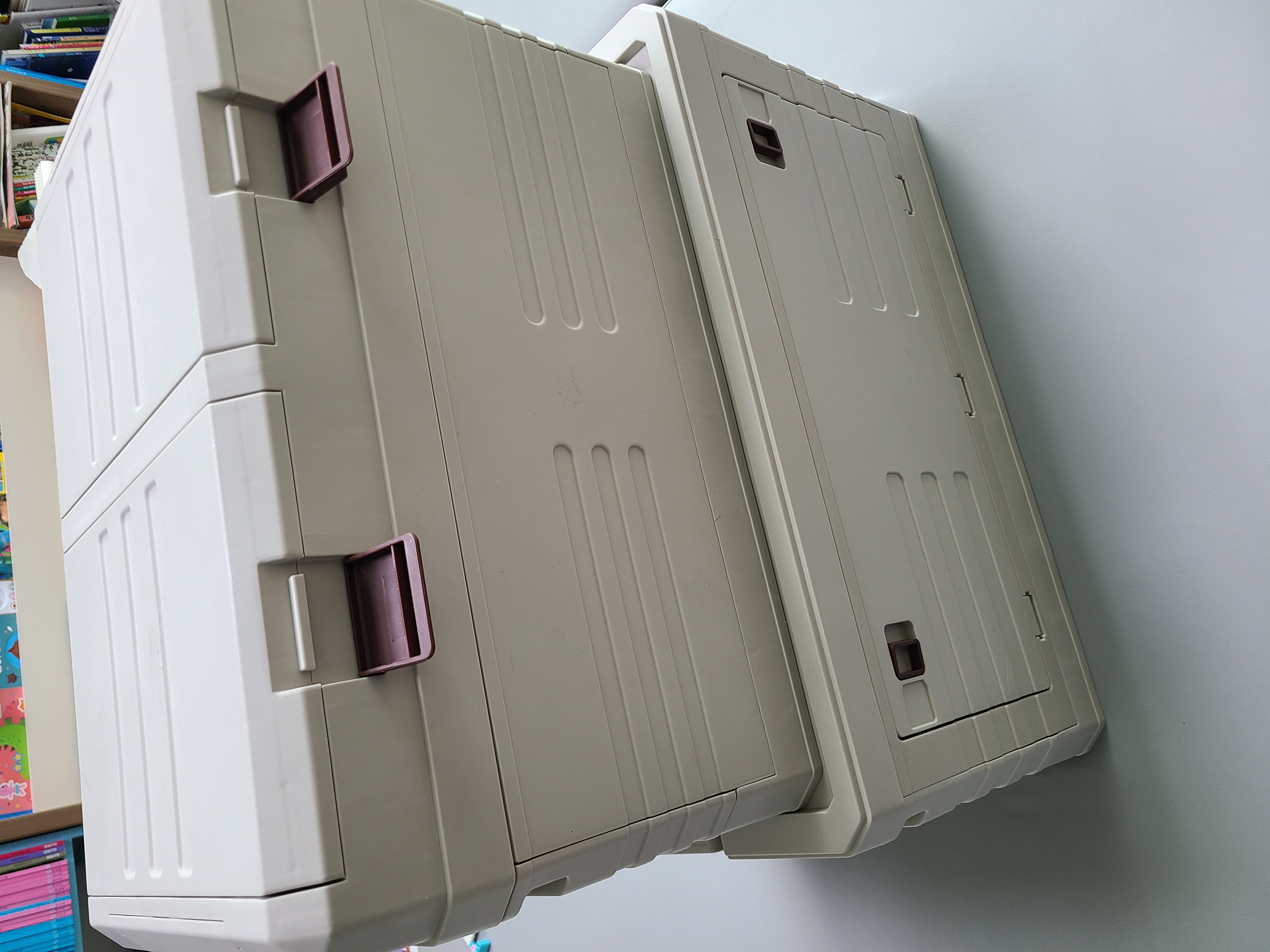 박스를 완전히 접었을 때의 모습입니다. 보관할 때 공간을 많이 차지하지 않아서 좋습니다. 좌측이 작은 크기의 35L 박스이고, 덮개에도 수납이 가능한 제품으로 구입하여 조금 더 솟아있습니다.