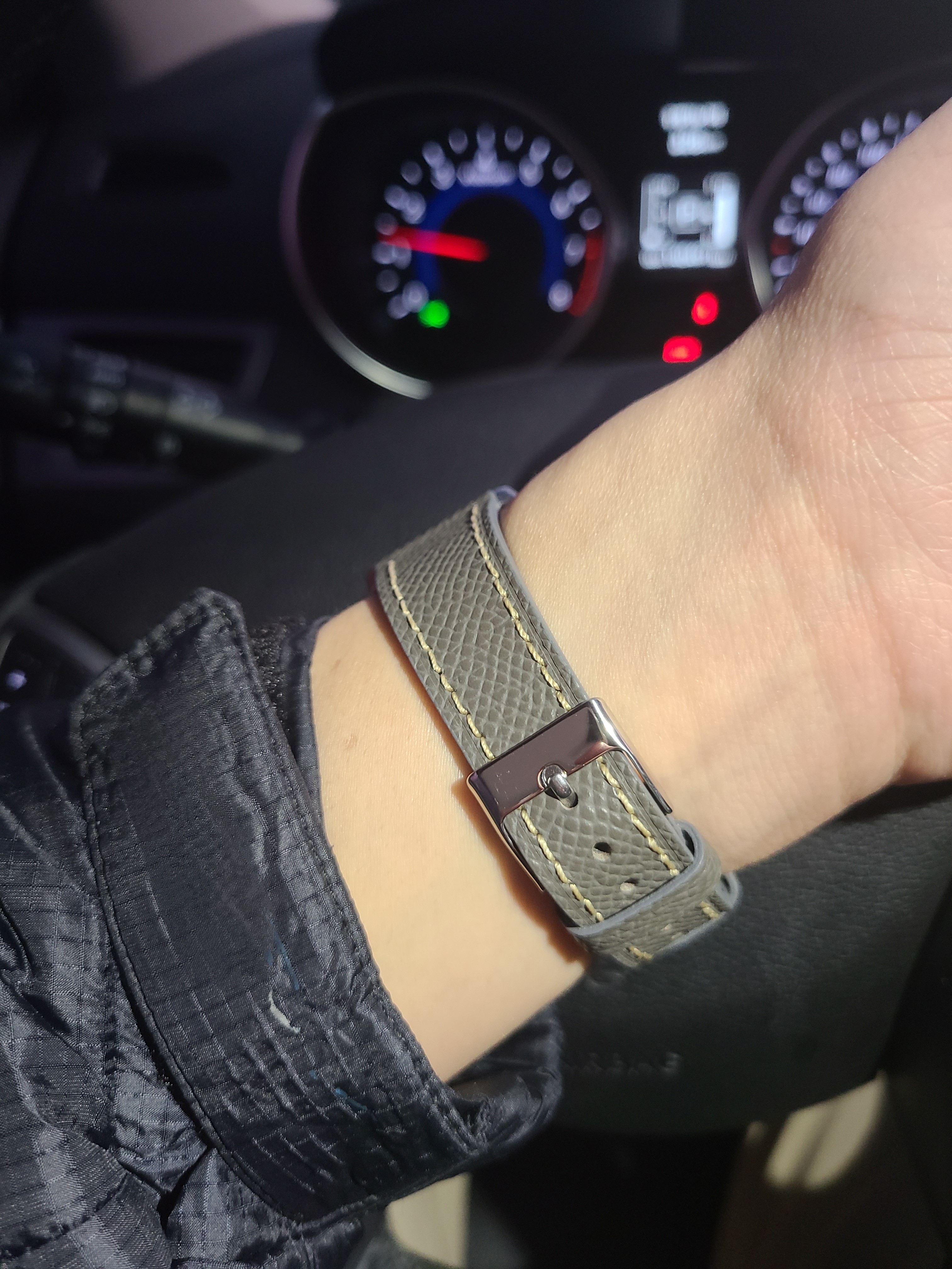 은색 선레이 다이얼이라 시계줄을 어떤 색으로 맞춰줘야 할지 고민이 많았는데, 코끼리색에 가까운 회색에 앱송(Epsom) 패턴, 베이지색의 스티치로 캐주얼한 스타일을 연출해봤더니 꽤나 잘 어울리는 것 같습니다.