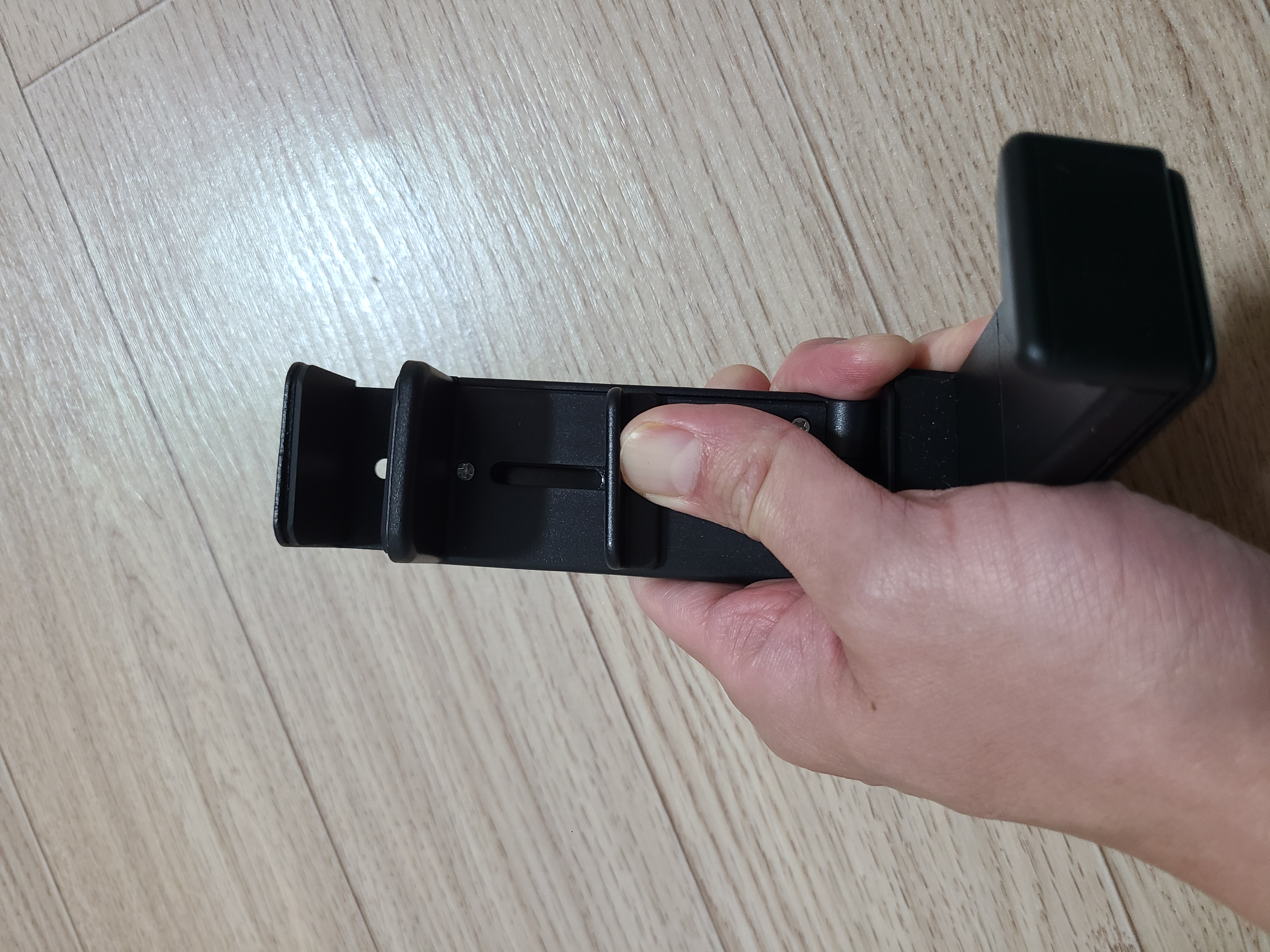 선반이나 테이블에 고정할 수 있도록 두께 조절이 가능합니다. 스프링의 반발력이 꽤나 강해서 잘 고정되어 있을 것 같다는 느낌을 받습니다. 물론 충격이나 흔들림에 떨어질 수 있겠지만, 그건 차량 스마트폰 거치대도 마찬가지이니 감안하고 사용하면 되겠습니다.
