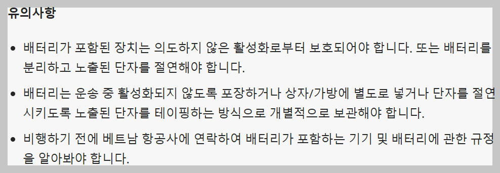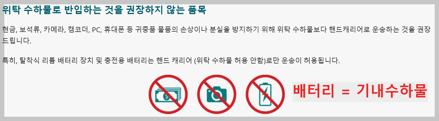 항공사 홈페이지에서 각종 전자기기나 배터리를 기내수하물로 휴대하라 합니다.