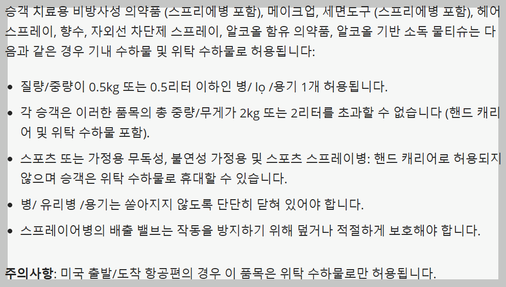 * 미국행/미국발 항공편을 이용하면 기내에 액체류가 허용되지 않습니다.