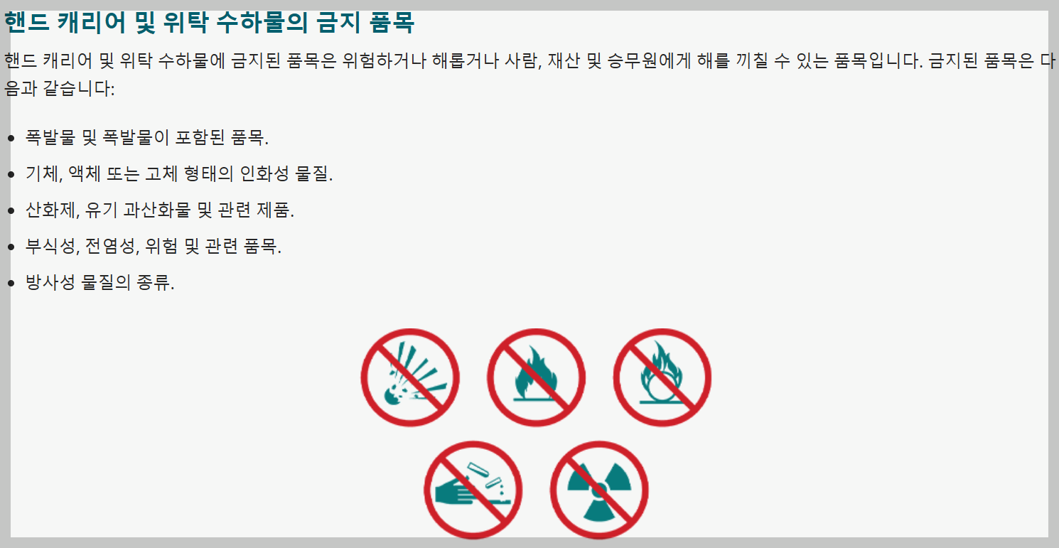 반입 금지 품목은 당연할만한 물건들인데, 폭발할 수 있거나 불이 날 수 있는 물건들은 기내수하물로도, 위탁수하물로도 가져갈 수 없습니다. 저는 특별히 해당하는 물건이 없을 것 같으니 넘어가겠습니다.