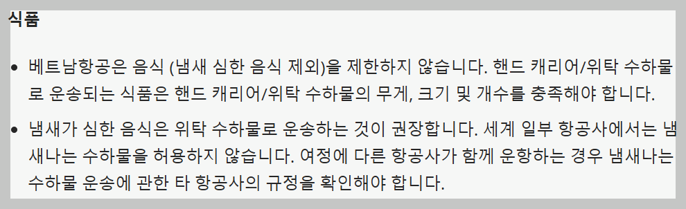 냄새가 너무 심한 음식이 아니라면 식품에 대한 제한은 없다고 합니다. 기내수하물이나 위탁수하물의 무게 규정에 맞게 식품을 운송하면 된다고 합니다. 냄새가 심한 음식을 운송하려거든 위탁수하물로 운송하라고 권장하고 있습니다.