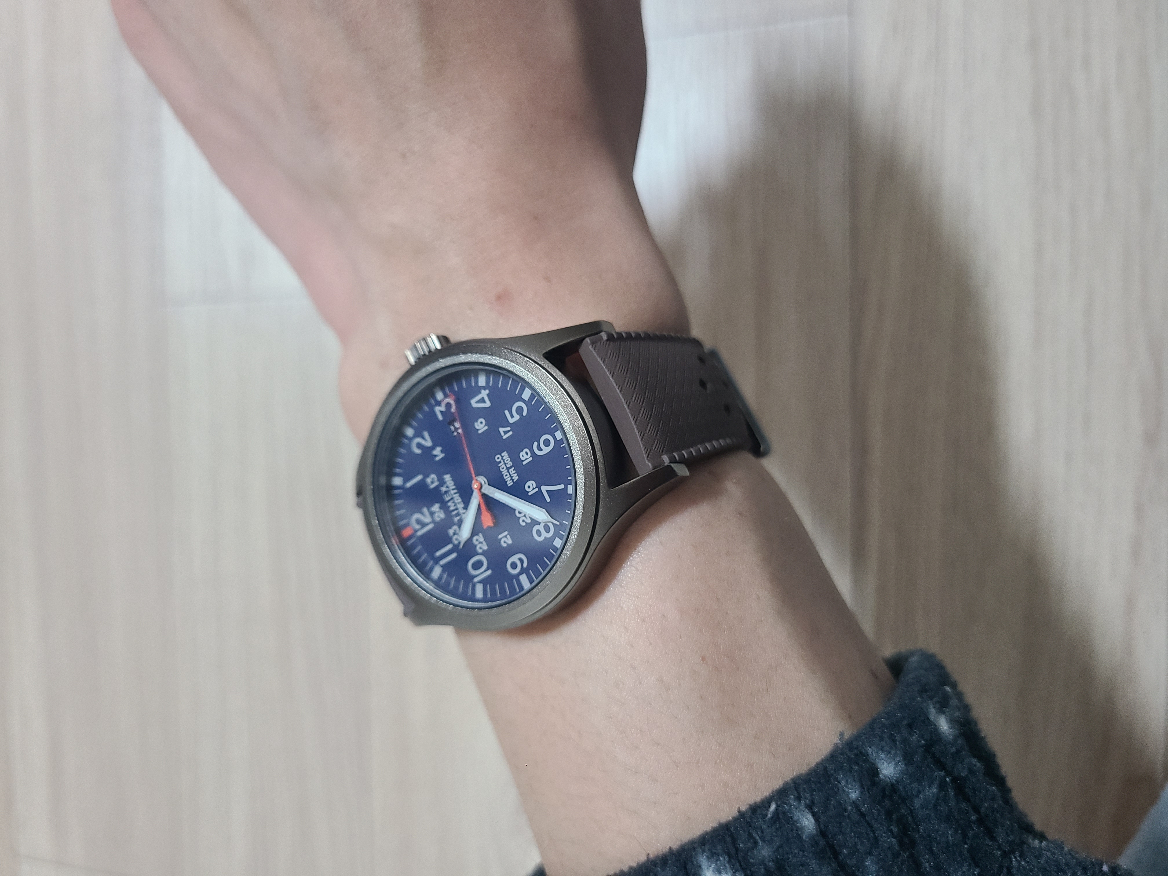 남색 다이얼에 빨간색(혹은 주황색이 약간 섞인 빨간색)으로 포인트를 준 디자인입니다. 덕분에 스포티한 느낌이 강해지는 것 같습니다. 케이스는 샌드블라스트 처리가 되어있는 것 같은데, 제 타이맥스 익스페디션 노스처럼 건메탈 코팅이 들어간건지 케이스 색이 어둡고 광택도 적습니다. 툴워치스러운 묵직함이 느껴지는 것 같습니다.