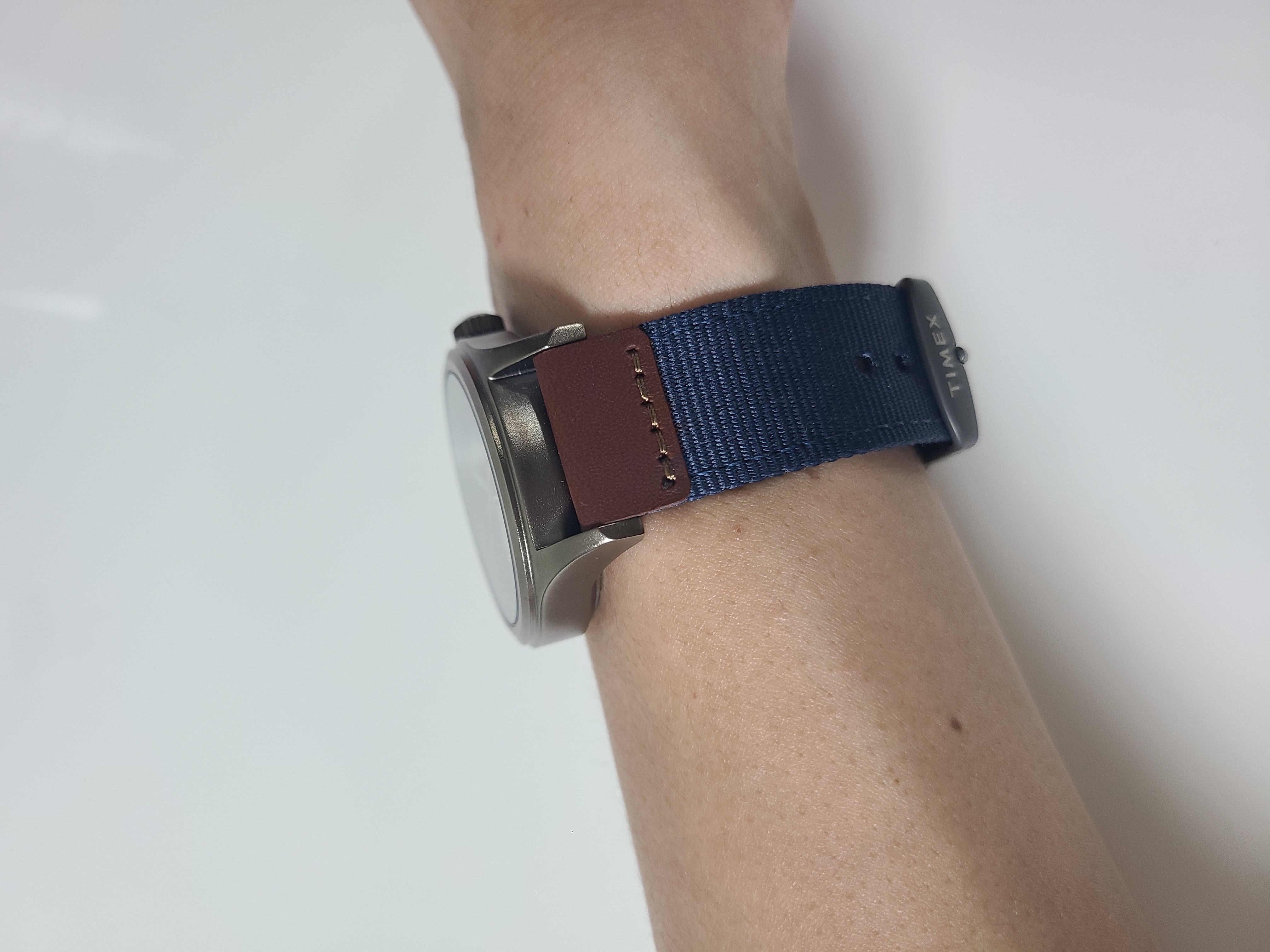 쿼츠 무브먼트를 탑재한 손목시계답게 얇습니다. 나일론에 갈색 가죽을 덧대어 내구성이 더 높아졌을 것 같지만, 조금 유치해보여서 줄을 바꿔주려 합니다.