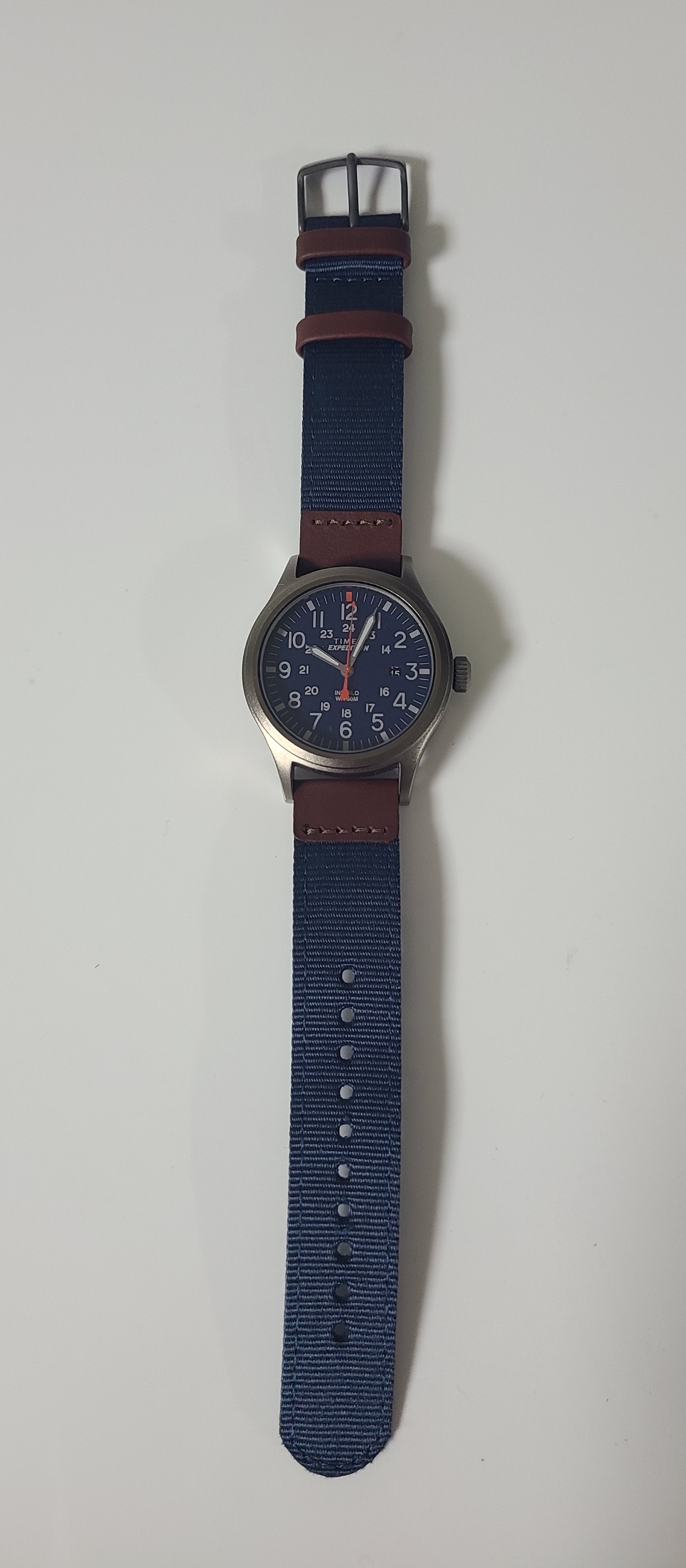 또, 자세히 보면 데이트창 (날짜창)이 있는데 다이얼의 색과 동일한 남색의 배경에 24시간계 인덱스와 동일한 흰색 폰트라 이질감이 적고 자연스럽게 어울리는 것 같습니다. 데이트창을 싫어하는 이유가 디자인을 해친다고 생각해서인데, 타이맥스 익스페디션은 잘 해낸 것 같습니다.