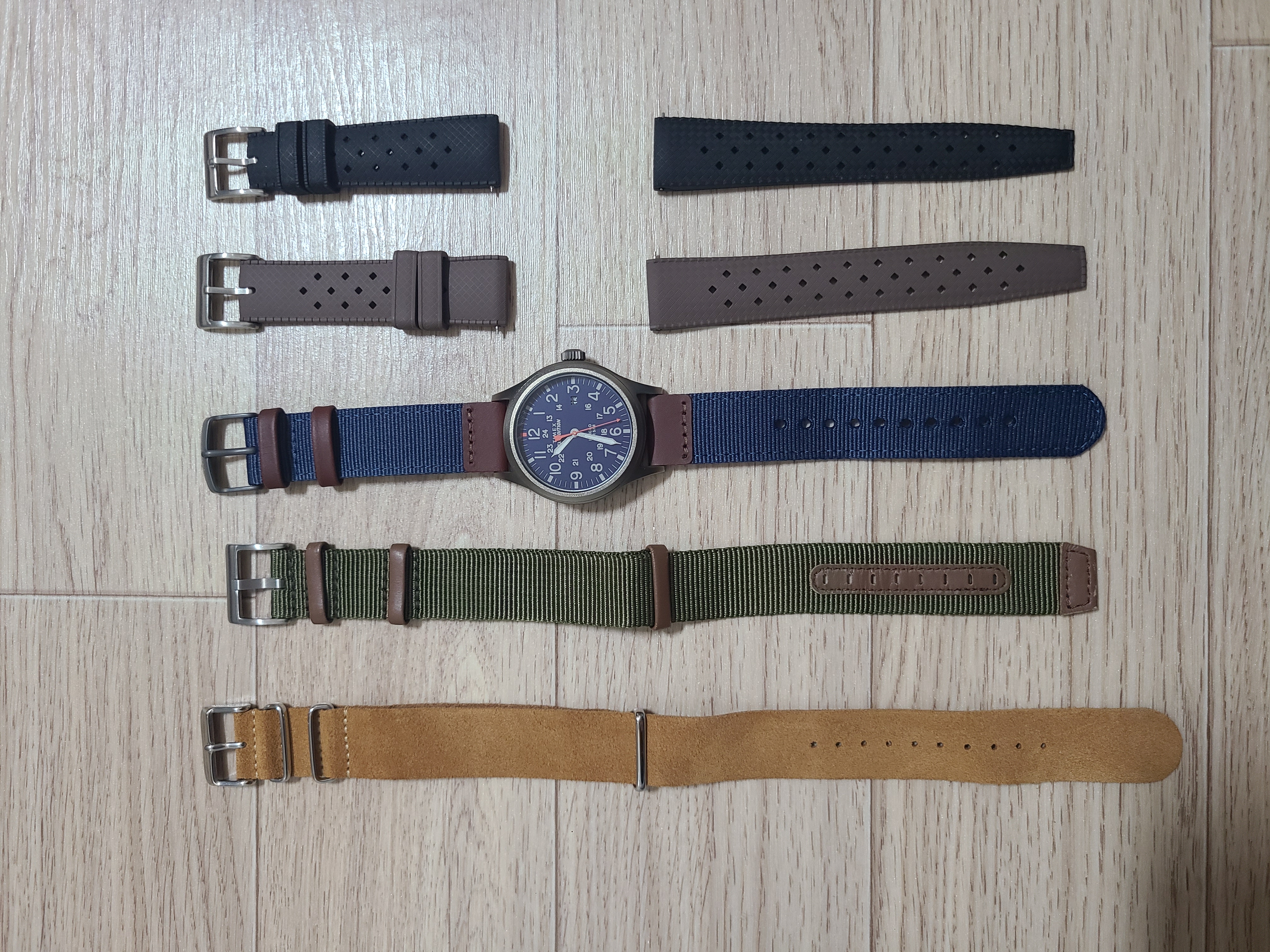 20mm 시계줄들을 몇 개 가져와봤습니다. 청색 다이얼엔 어떤 시계줄이 가장 잘 어울릴까 고민을 해봤는데, 얼핏 봐도 제치 스트랩에 사용한 갈색 시계줄이 가장 잘 어울릴 것 같다는 생각이 듭니다.