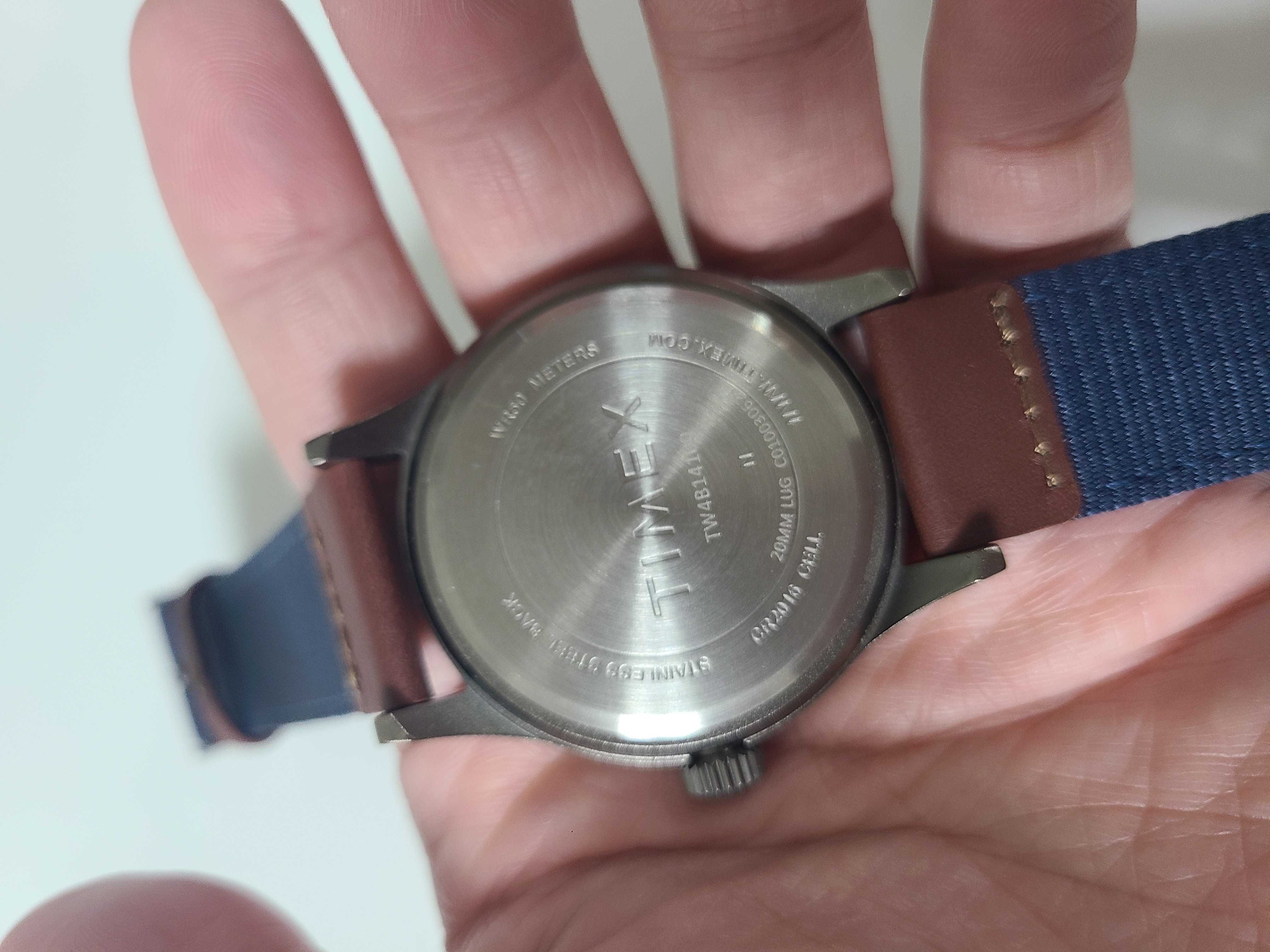 케이스 뒷면엔 심플한 각인이 들어가있습니다. TIMEX와 레퍼런스 넘버인 TW4B14100이 새겨져 있고, 주변으로는 다른 손목시계에서도 흔히 볼 수 있듯 시계에 대한 정보가 각인되어 있습니다.