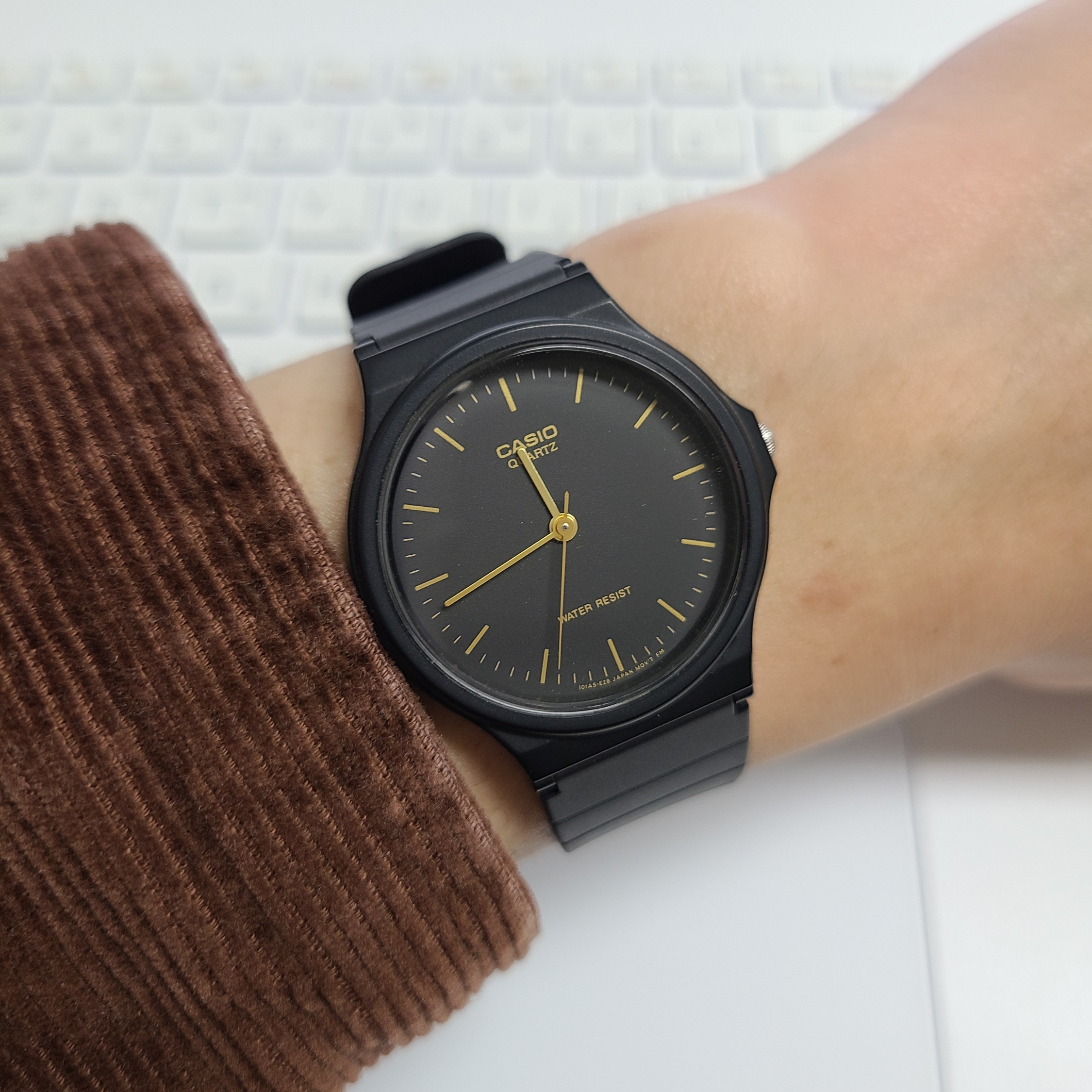 MQ24는 다이얼이나 핸즈의 디자인에 따라 아형으로 나뉘는데, 제가 가지고 있는 카시오시계는 MQ24-1E 입니다. 검은색 다이얼과 대조되는 금색 인덱스와 핸즈의 색감이 마음에 들었고, 시인성도 좋다는 장점이 있습니다.