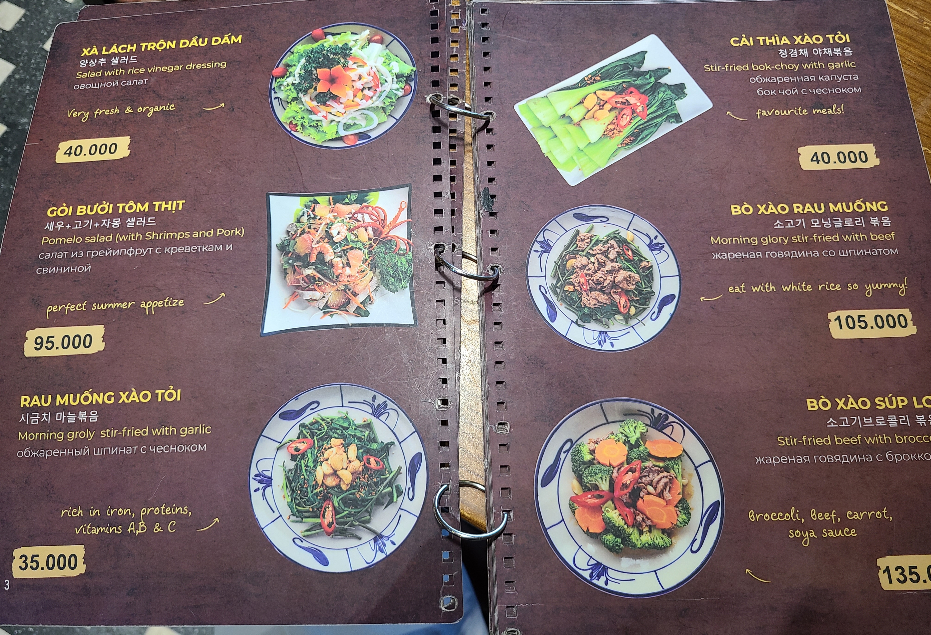 메뉴판에 한국어 번역까지 준비해둔걸 보고 또 한번 알 수 있었습니다. 또, 실제로 식사 중 한국인들이 많이 보이기도 했습니다. 외국에 나와서 한국인이 많은 장소를 가는걸 그리 좋아하진 않지만, 아이가 외국에서 식사를 한 적이 없으니 우선은 검증된 곳에서 식사를 해야만 했습니다. 이 메뉴판에서는 시금치 마늘볶음을 시켜서 먹었는데, 어디서든 모닝글로리 (Morning glory)라 하면 알아듣는 음식인 것 같습니다. 베트남 여행 중 먹었던 모닝글로리 중 촌촌킴에서 먹었던 모닝글로리가 가장 맛있었습니다. 배가 고파서 그랬던걸까 싶기도 하지만, 그래도 촌촌킴 모닝글로리 맛이 계속 생각이 납니다.