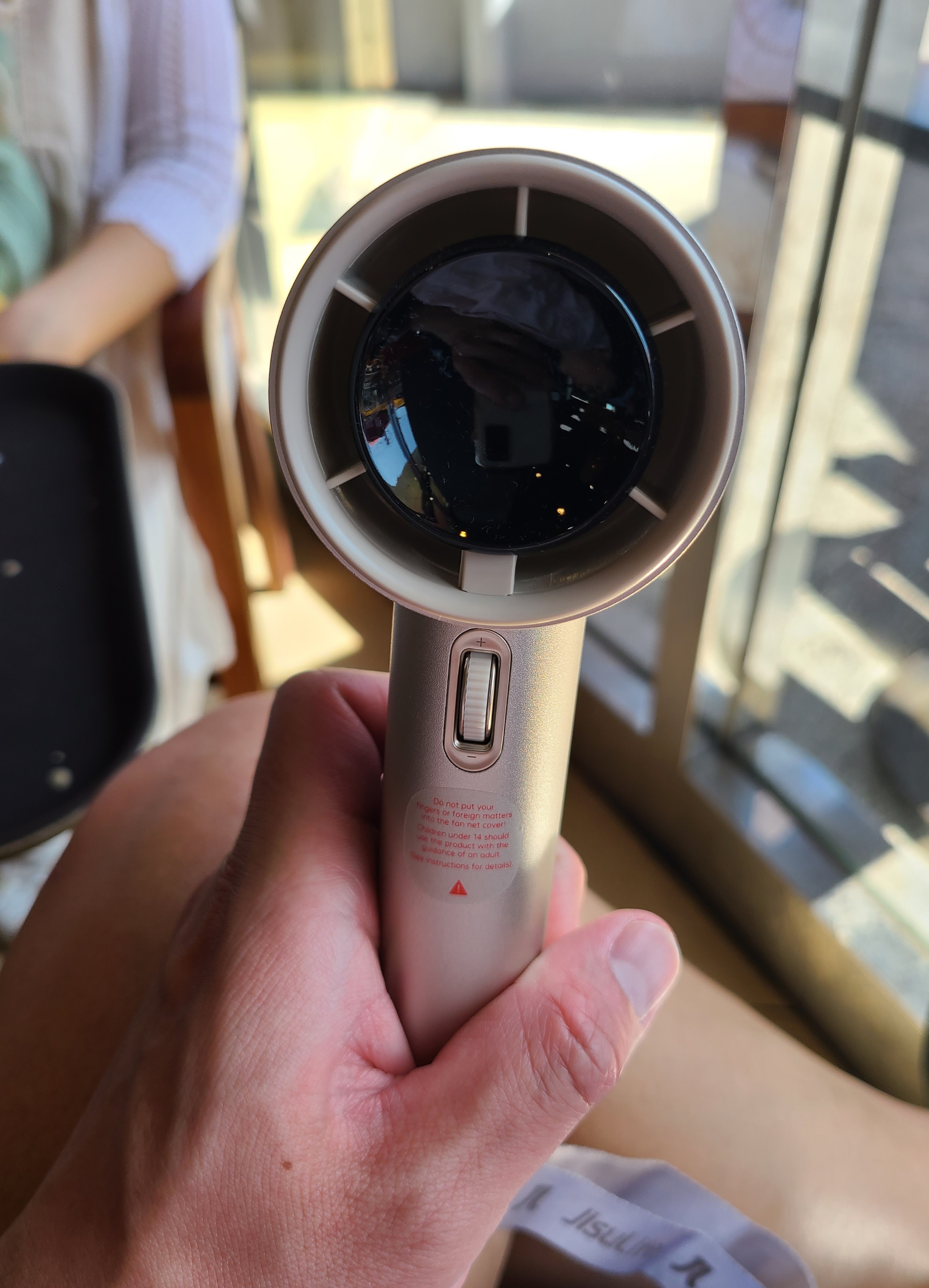 이번 여행을 위해 구입한 JISULIFE 휴대용 선풍기입니다. 1단계부터 100단계까지 바람의 세기를 미세하게 조절할 수 있어서 아이에게 사용하기 좋을 것 같아 구입했습니다. 앉은 곳이 창가자리라 햇빛이 들어 더웠는데, 아이가 잠든 동안 약하게 바람을 쐬어주었더니 땀흘리지 않고 잘 잤습니다.