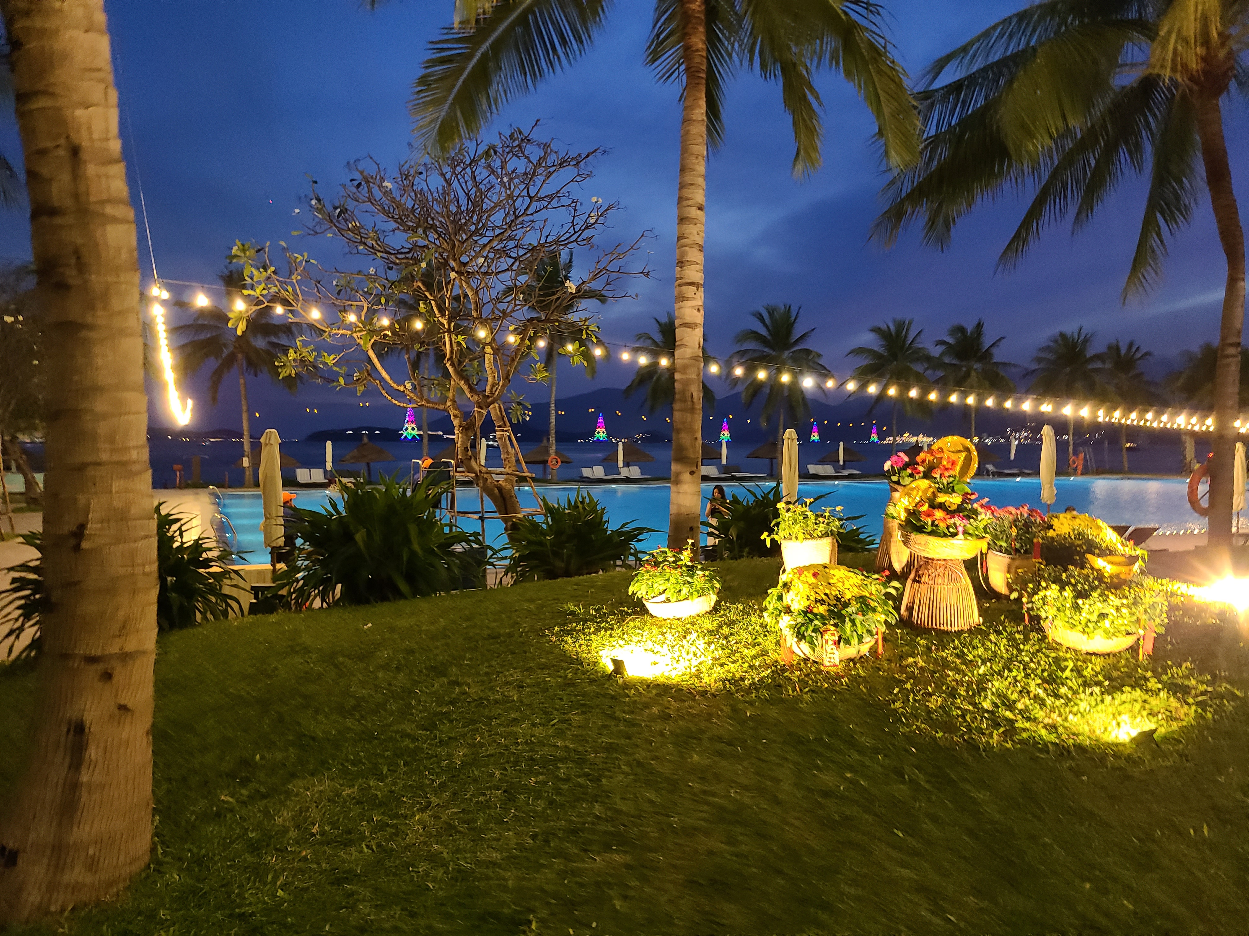 첫 날은 해가 저문 뒤 물놀이를 시작하게 되어서, 얼마 놀지 못하고 금방 씻으러 들어갔습니다. 씻고 나오니 해가 저물어서 반짝이는 조명들이 또 다른 풍경을 만들어내고 있었습니다.