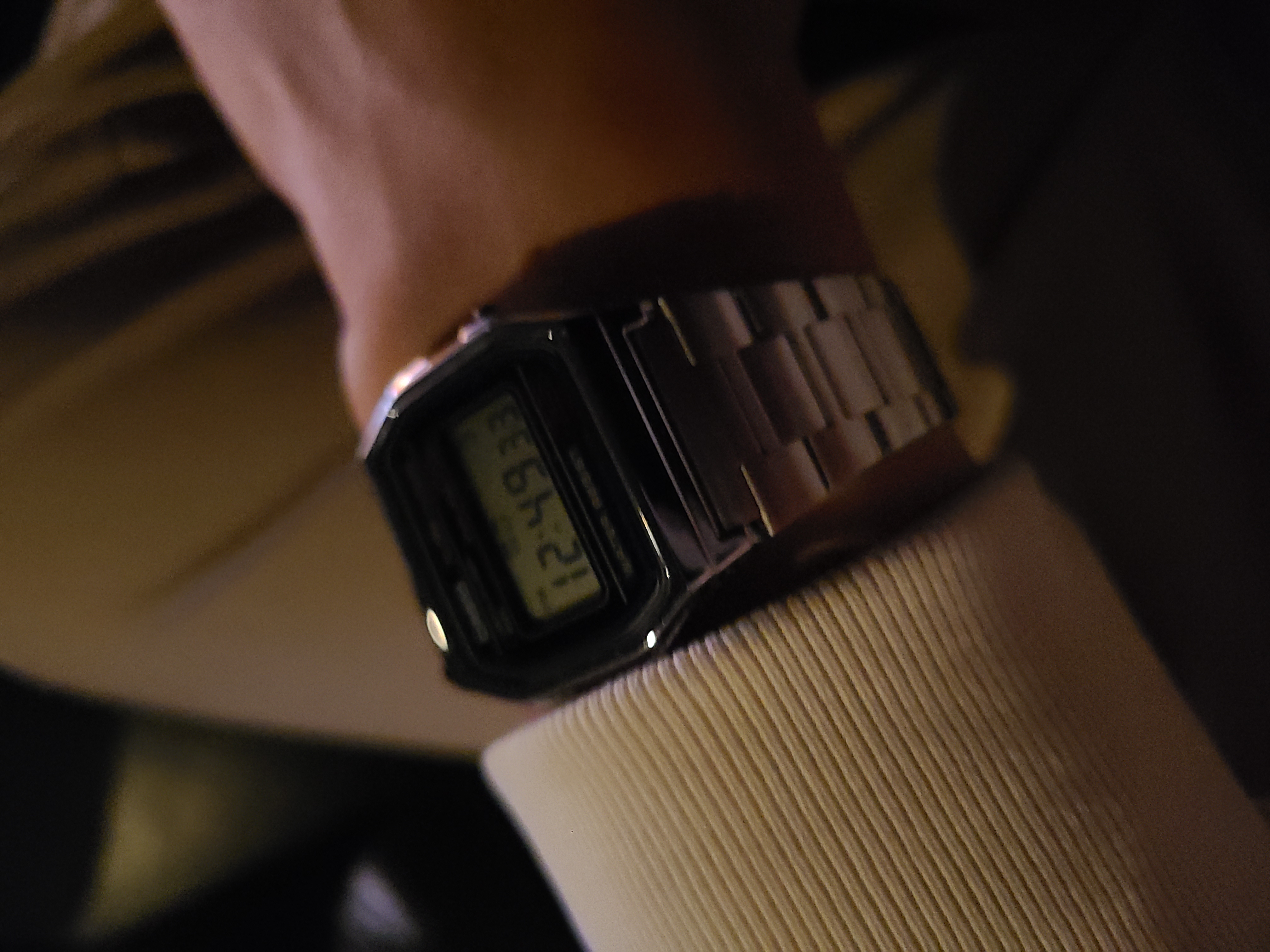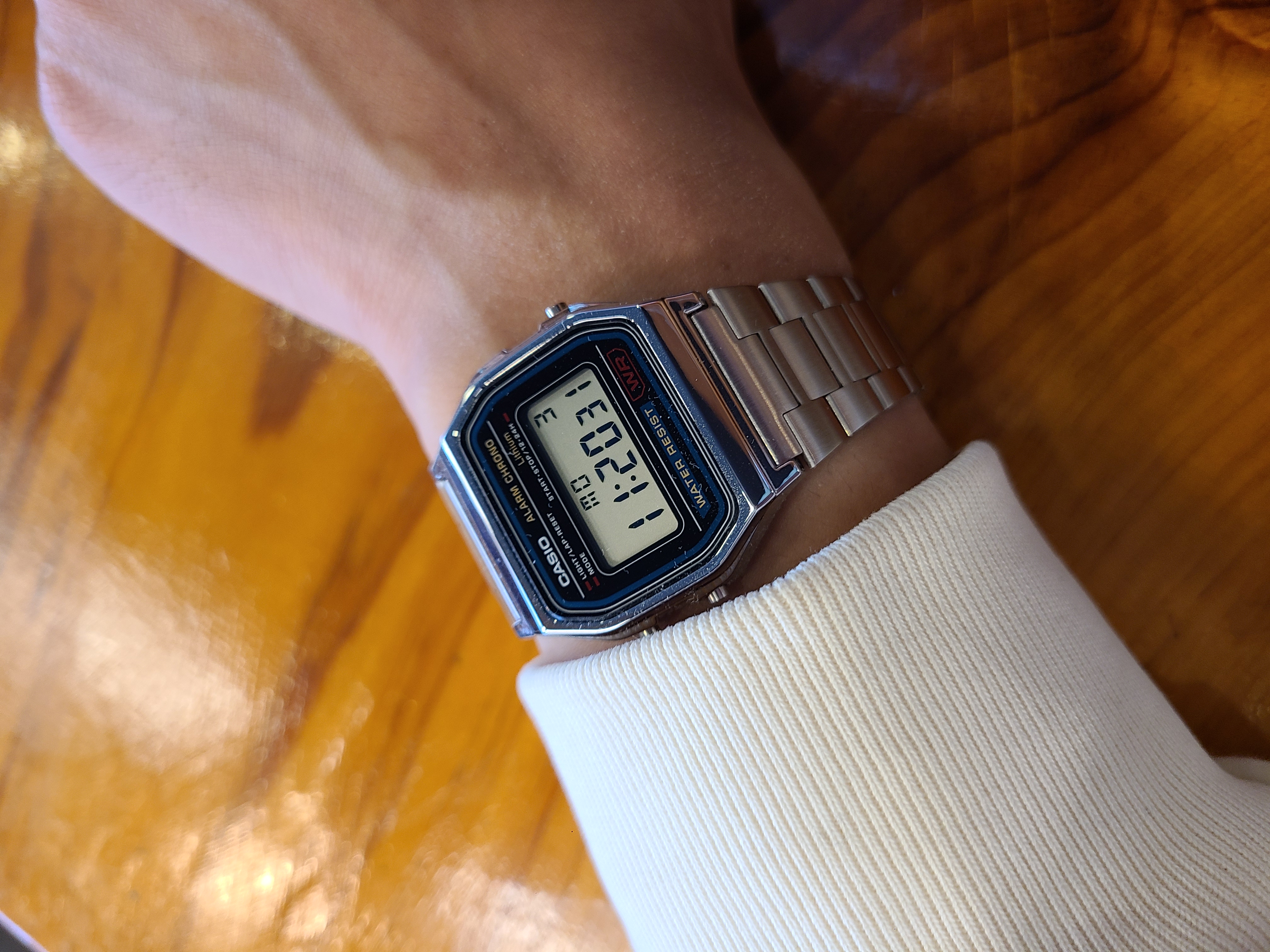 오늘 착용하고 나온 손목시계는 손석희 시계로도 유명한 카시오 A158 모델입니다. 이 카시오시계는 메탈 브레이슬릿에 은빛으로 도금된 케이스 덕에 전자시계임에도 굉장히 반짝거립니다.