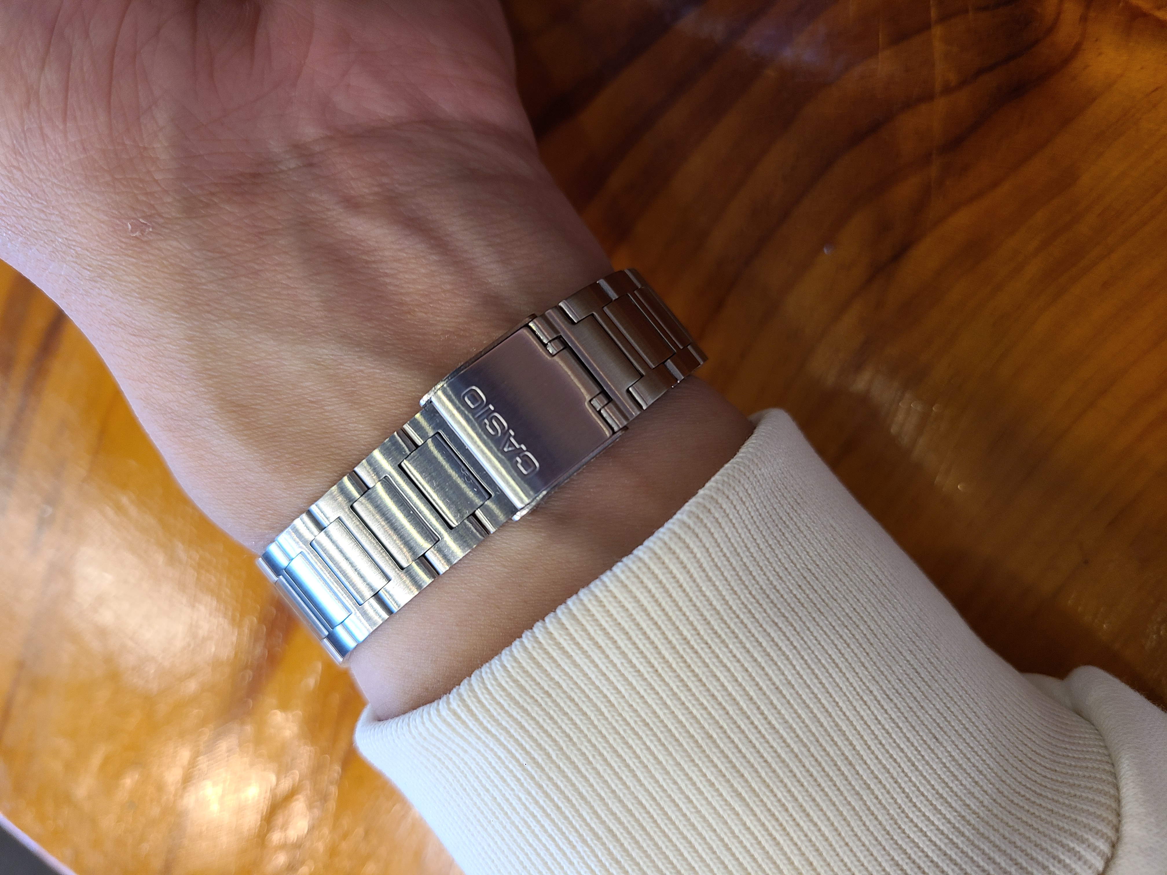 시계가 굉장히 얇은데다가 일체감있는 얇은 브레이슬릿이 채택되어 착용감이 좋습니다. 가볍고 얇은 시계는 착용감이 좋을 수밖에 없는데, A158은 시계줄 조정도 미세하게 할 수 있어서 더욱 편안해집니다. 정말 훌륭한 시계입니다.