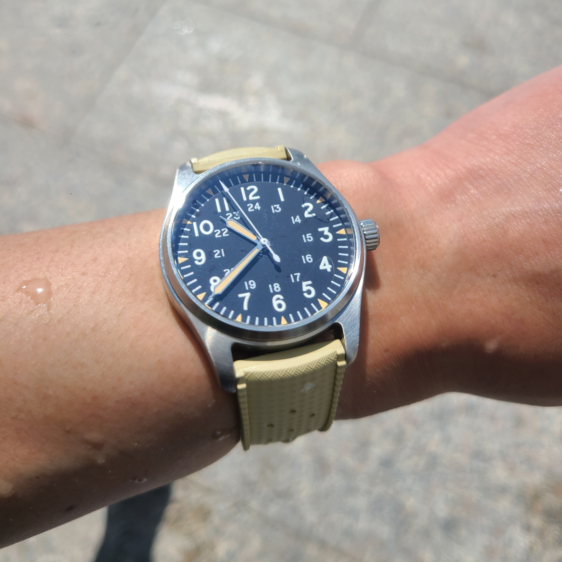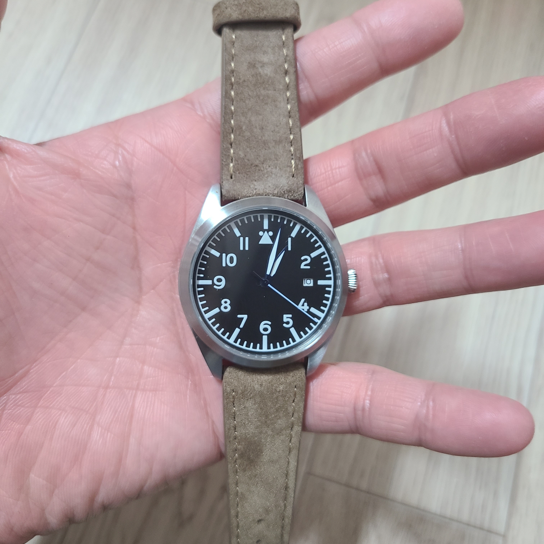 단점) 하지만 자주 사용하다보니 아쉬운 점이 조금씩 눈에 들어오게 되었습니다. 저는 손목시계 다이얼의 비례, 대칭이 깨지는 것을 싫어하는데, 그런 점에서 알리 플리거에 날짜창이 있다는 점이 거슬렸습니다. 숫자 3이 사라지고 작은 날짜창이 생겨버리니 말입니다. 또 이 손목시계는 11-12mm 정도의 두께를 가지고 있는데, 아주 두껍다 보긴 어렵지만 겨울에 착용하기엔 거슬리는 두께라 아쉬웠습니다. 물론 가을까지는 잘 사용했으니 두께보다는 날짜창이 있는게 저에게 더 큰 아쉬움이었습니다.