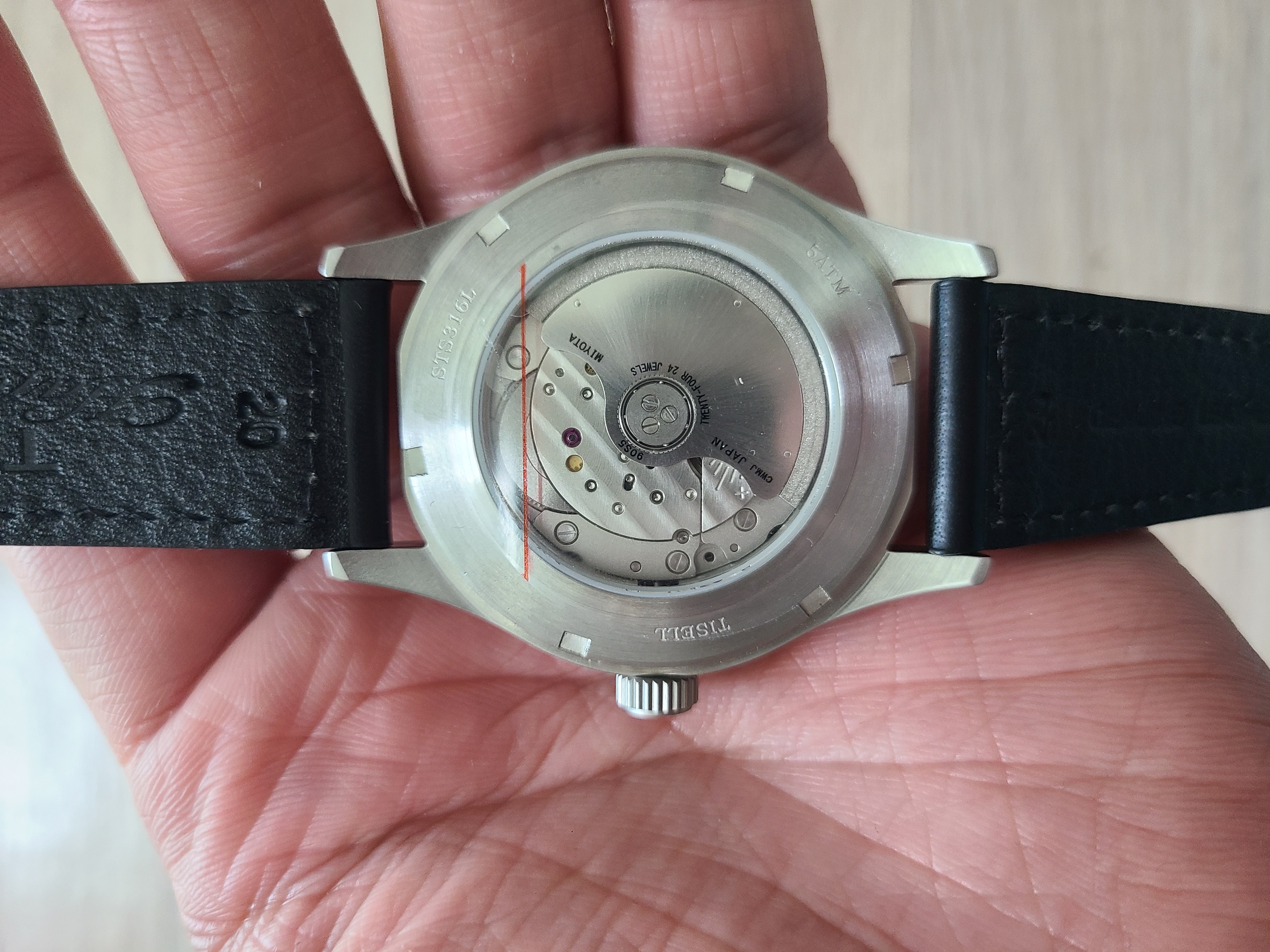 저는 손목 둘레가 17.5cm 정도 되기 때문에 러그 투 러그가 50mm를 넘어가면 손목에 올리기가 부담스럽습니다. 그래서 케이스 직경이 40mm를 넘지 않았으면 했고, 러그 투 러그는 50mm를 넘지 않았습면 했습니다. 제가 원하는 조건을 만족하면서 두께가 9.5mm로 굉장히 얇습니다. 10mm 미만의 두께가 가능한 것은 바로 미요타 90S5 무브먼트를 사용했기 때문입니다.