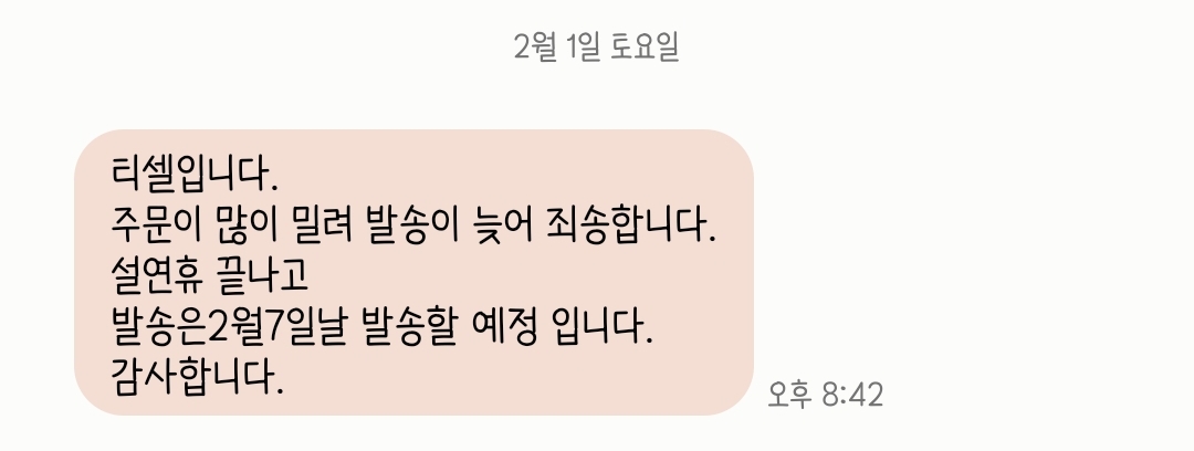 마이크로브랜드인 티셀의 손목시계를 굳이 설연휴에 구입했으니 배송이 늦어지는건 어쩔 수 없겠다 싶었습니다. 그래도 며칠 지나 약속한 날짜가 되니 이렇게 발송 확인 문자가 날아왔습니다.
