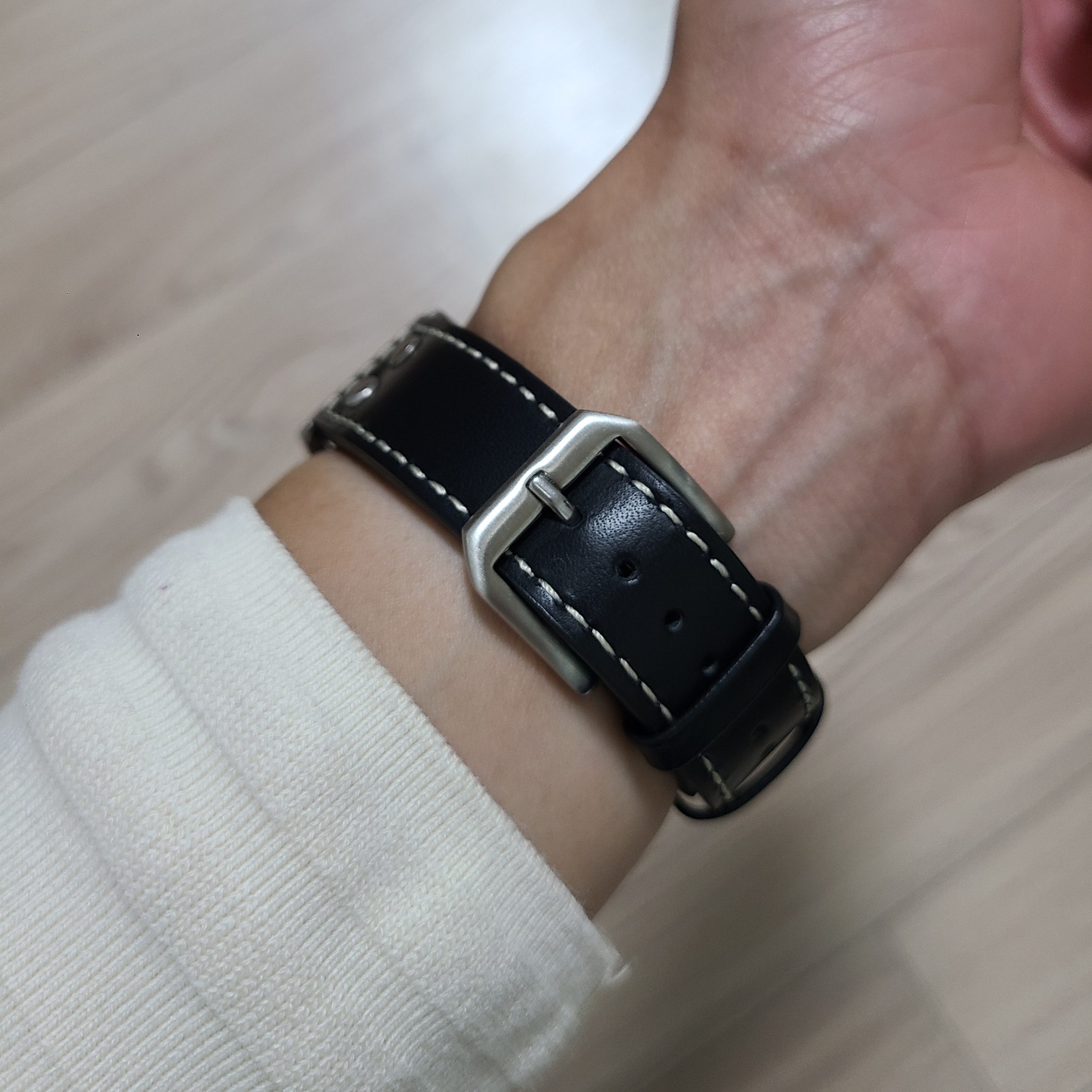 저는 이전 알리 플리거에서 갈색 리벳달린 시계줄(스토바 스타일 스트랩)을 사용해왔어서 검은색 시계줄이 체결된 모습을 실물로 보는건 처음인데, 이것도 꽤 괜찮은 것 같습니다. 시계줄이 가죽이더라도 재질에 따라 드레시한 분위기를 연출하기도 하고, 캐주얼하거나 터프한 이미지를 만들어내기도 합니다. 이 시계줄은 터프하면서도 예의를 차린 듯한 느낌을 주는 것 같습니다. 리벳이 박혀있는 검은색 가죽 시계줄이 두껍긴 하지만 약간의 광택이 있어서 그렇게 느낀 것 같습니다.