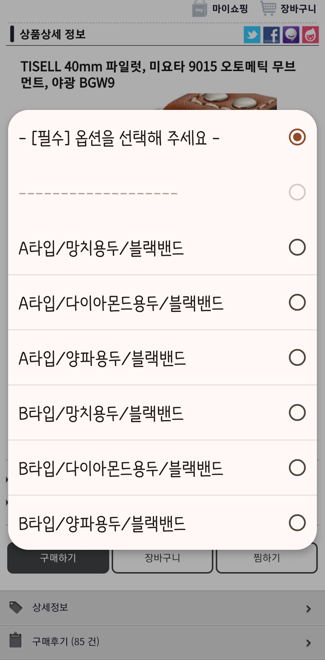 티셀 홈페이지에 들어가보시면 구입 페이지에서 상세 모델을 고르는 메뉴가 나옵니다. 크게 플리거 A타입, 플리거 B타입으로 나뉘고 각 타입에서 용두 모양을 또 망치용두, 다이아몬드용두, 양파용두로 나누어서 고를 수 있습니다. 원래는 검은색 시계줄(사진의 블랙밴드)과 갈색 시계줄을 고를 수 있었던 것 같은데, 지금은 검은색 시계줄만 고를 수 있습니다. 시계줄이야 따로 구입해도 되니까 큰 상관은 없을 것 같습니다.