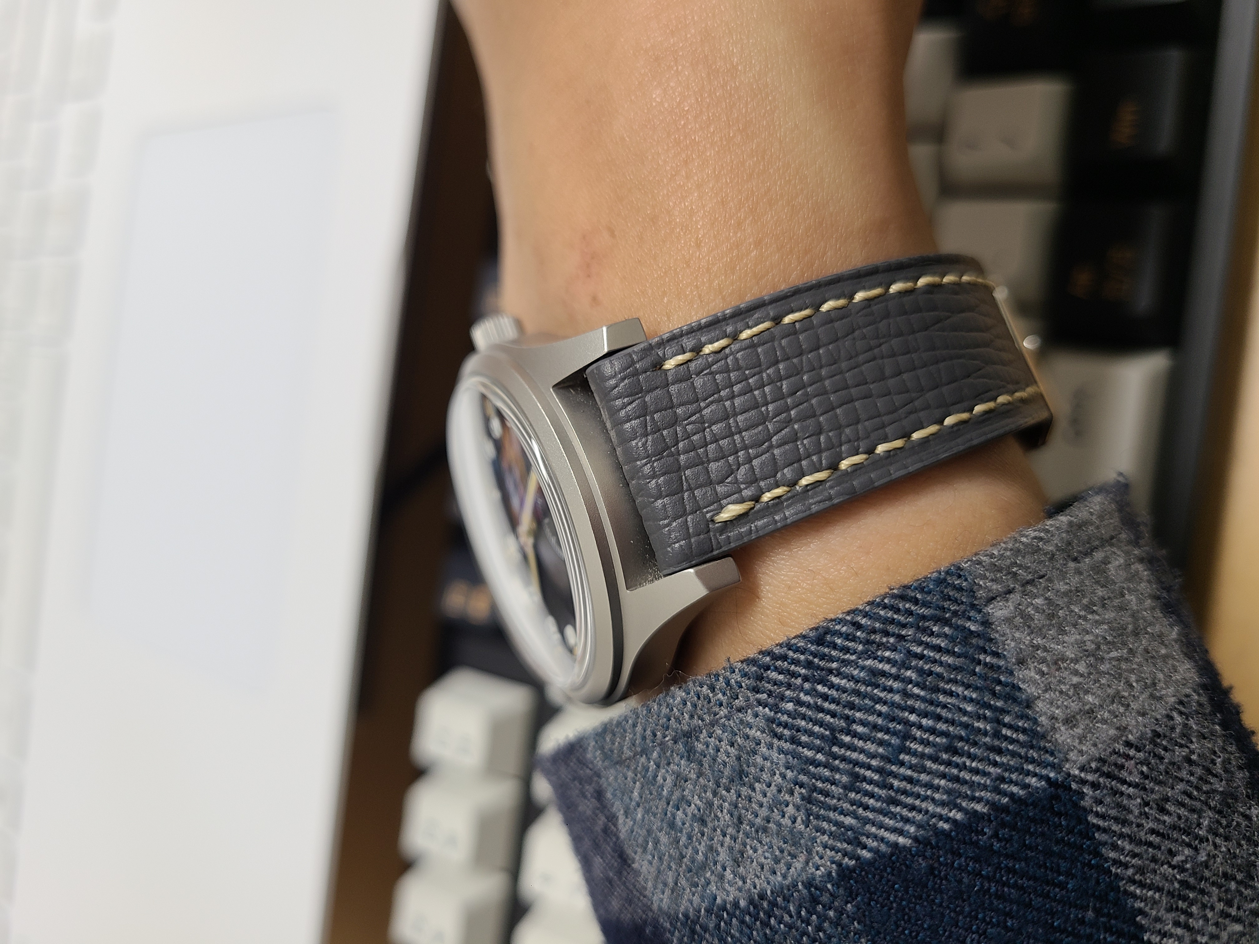 돔형 글라스는 아주 극단적인 곡률을 가지고 있지는 않아서 부드럽고 자연스러운 느낌이 듭니다. 지금 사용하고 있는 이 회색 가죽 시계줄은 알리에서 구입한 앱송(Epsom) 스타일의 스트랩입니다. 패턴이 상품 판매 페이지와 좀 다른데, 나름 괜찮은 색감과 패턴이라 그냥 사용하는 중입니다. 알리익스프레스니까, 하고 그러려니 합니다.