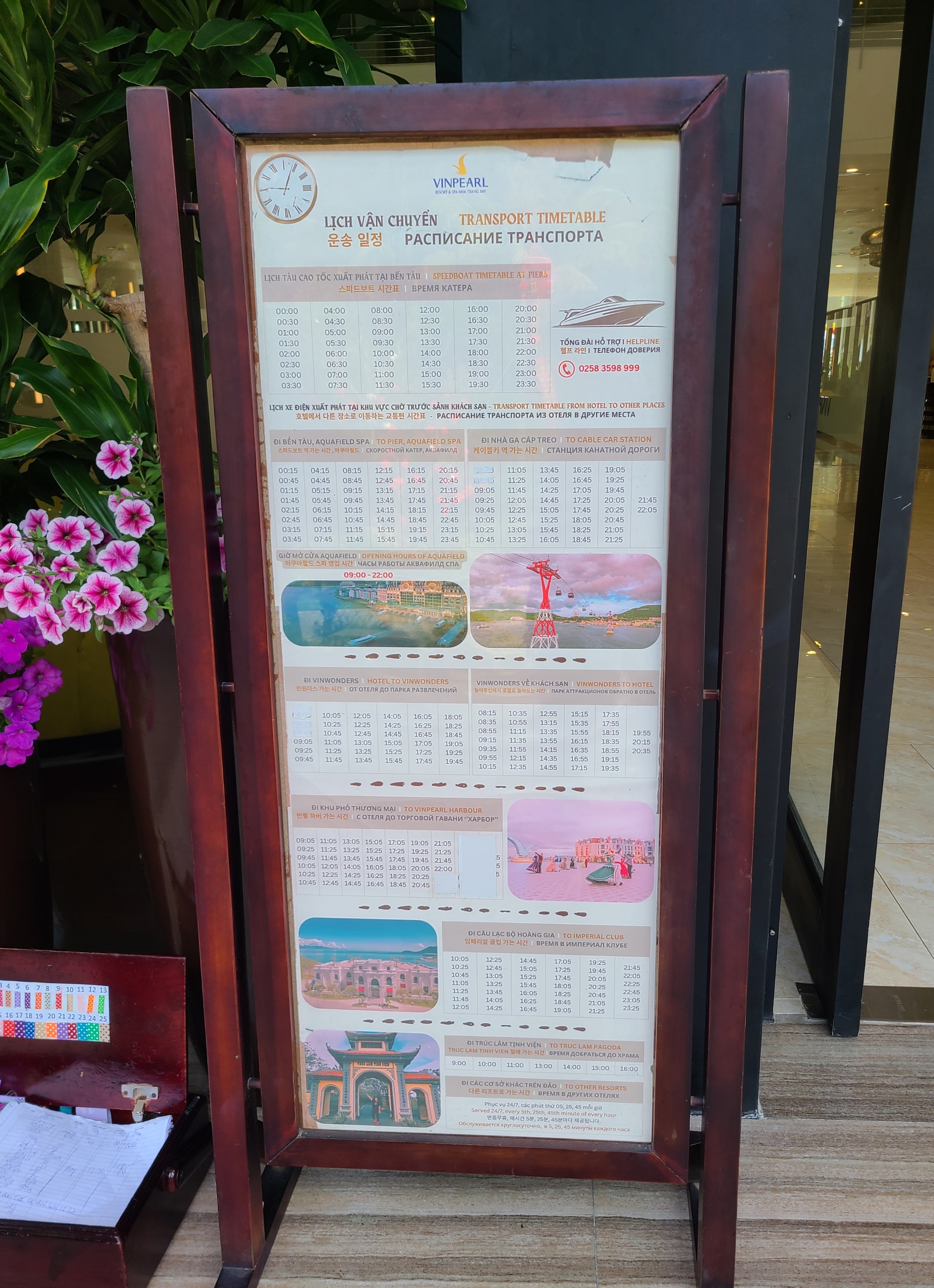리조트에서 나트랑 시내로 나가려면 스피드보트를 타야하므로 우선 리조트에서 스피드보트 선착장 가는 버기 시간표를 확인하셔야 하고, 스피드보트가 언제 출발하는지도 확인하셔야 합니다. 모든 시간표는 한국어로도 설명되어 있으니 어렵지 않게 확인하실 수 있습니다.