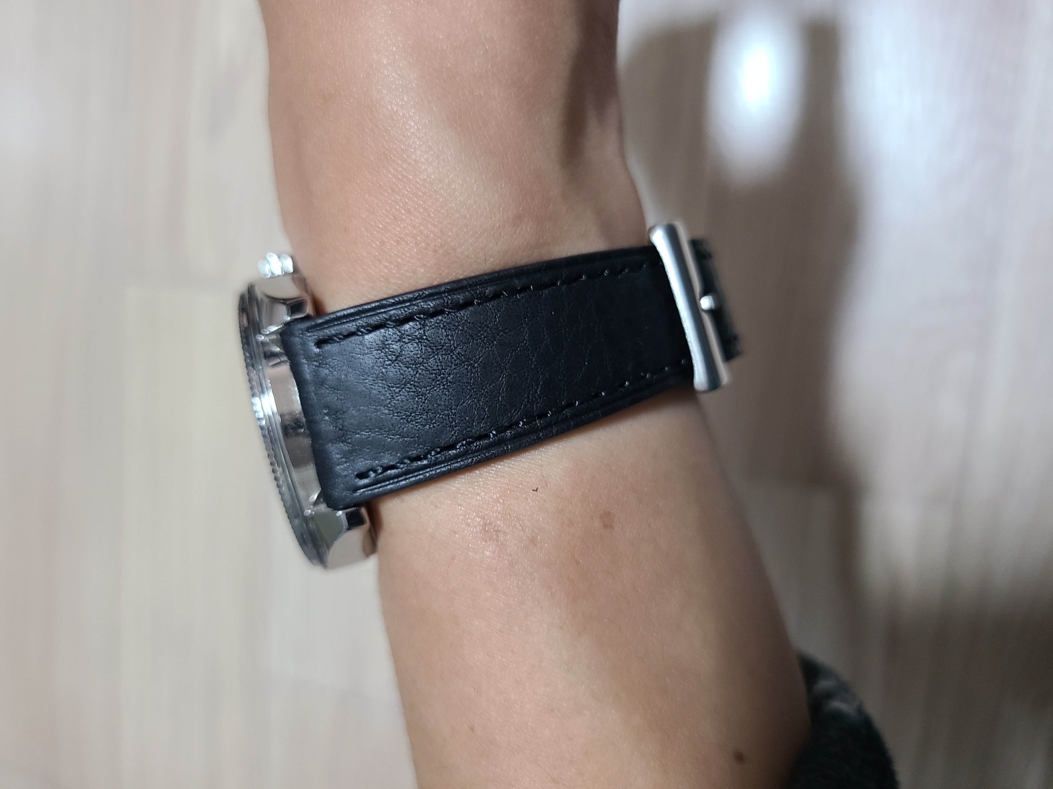 검은색 다이얼에 검은색 가죽 시계줄은 언제나 잘 어울리는 조합이지요. 시계줄을 바꾸고 나니 시크한 모습으로 바뀐 것 같네요. 이 맛에 줄질하나 봅니다.