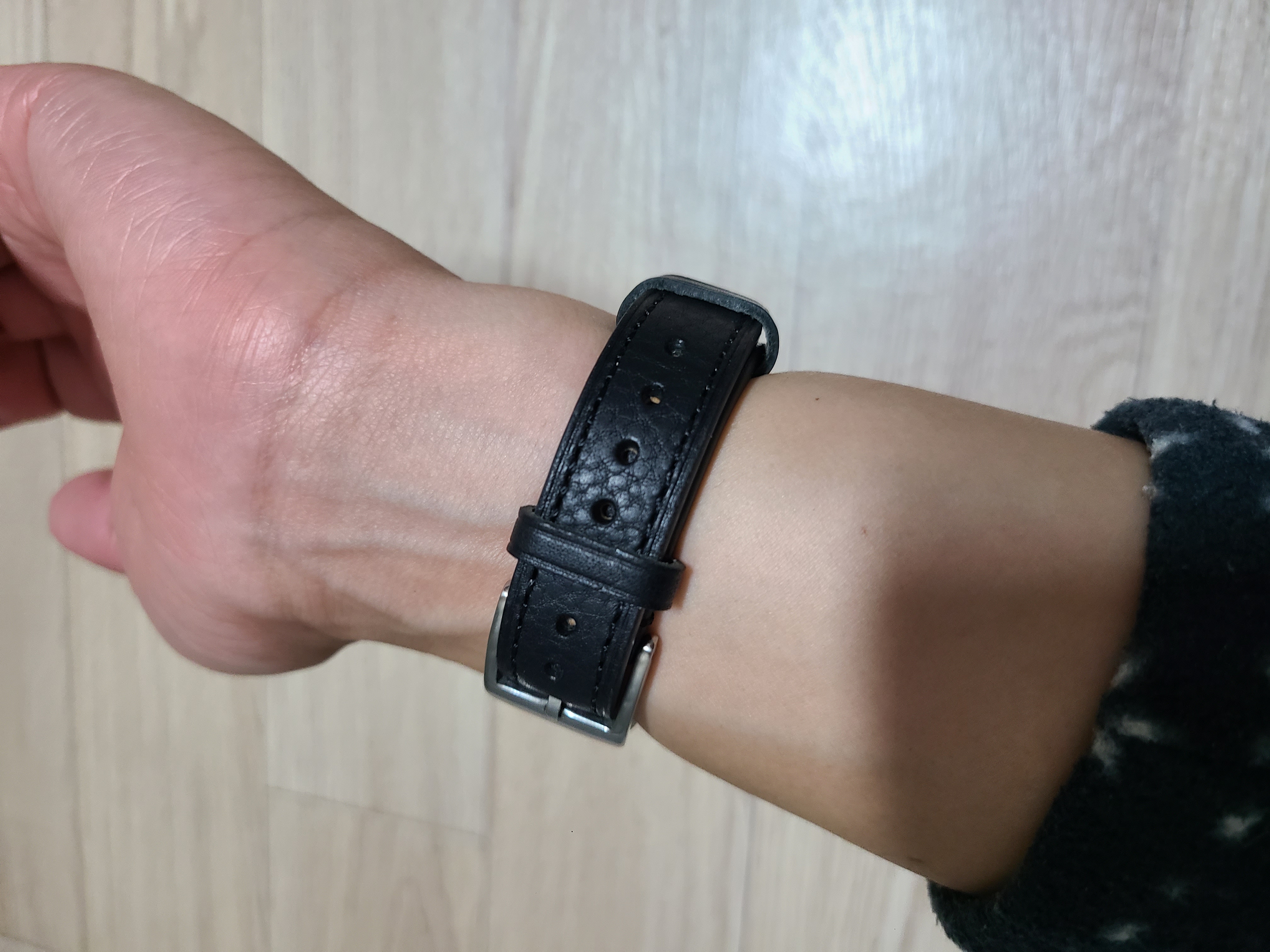 이어서 착용해봤습니다. 가죽이 적당한 두께를 가지고 있어서 아주 부드럽다고 느껴지지는 않지만, 그렇다고 많이 불편한 정도는 아닙니다. 가죽 시계줄은 처음에 길들이는 과정이 필요한데, 이정도면 너무 뻣뻣해서 못쓰겠다 싶은 정도는 아닙니다. 둥글게 말아가면서 사용하면 될만한 시계줄이라 느껴집니다.